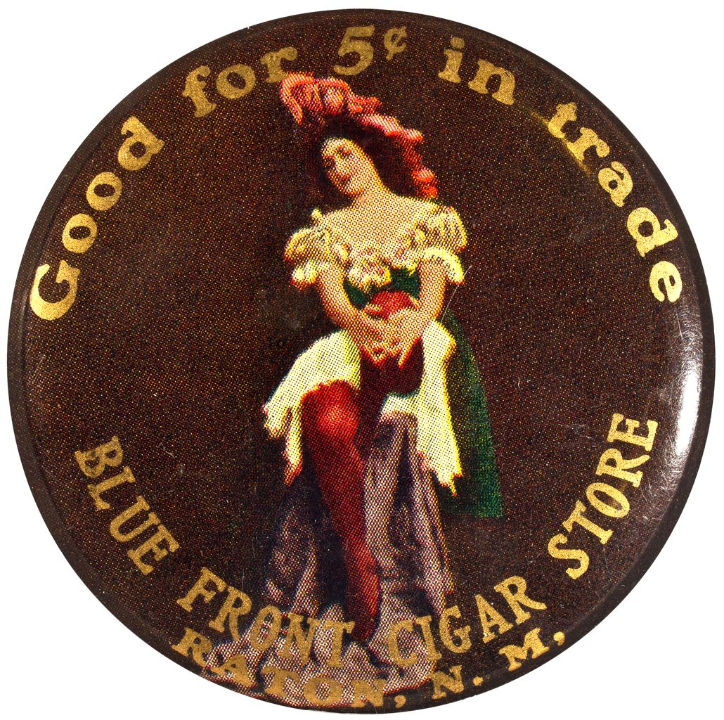 "Good For 5 cents in Trade“ Obverse side is gold text on image. This image is very detailed; it has very bright colors and great clarity. A woman in a dress with a pretty, red and black, flamboyant hat is sitting on a stool. She is provocatively pulling her left leg towards her chest as she clasps her knee in her hands. The upper thighs are exposed in skin tight red stockings. Her head is cocked to the left. She has a look of lust in her eye and she has considerable cleavage exposed. "Good for 5 cents in Trade/ Blue Front Cigar Store/ Raton, NM" This is one of the great western rarities. Overall Exquisite Condition. -49892