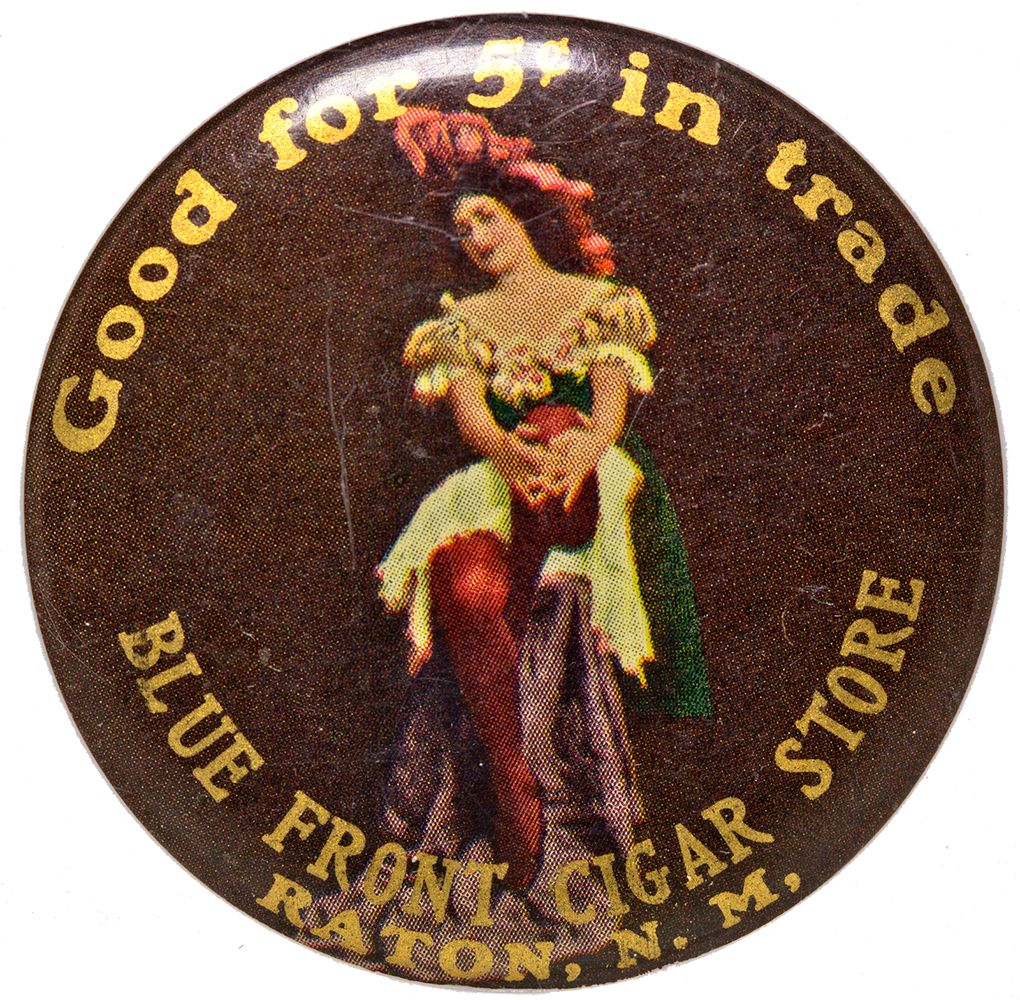 c1908 "Good For 5 cents in Trade“ Obverse side is gold text on image. This image is very detailed; it has very bright colors and great clarity. A woman in a dress with a pretty, red and black, flamboyant hat is sitting on a stool. She is provocatively pulling her left leg towards her chest as she clasps her knee in her hands. The upper thighs are exposed in skin tight red stockings. Her head is cocked to the left. She has a look of lust in her eye and she has considerable cleavage exposed. "Good for 5 cents in Trade/ Blue Front Cigar Store/ Raton, NM" This is one of the great western rarities. Overall Exquisite Condition. - HKA#65798