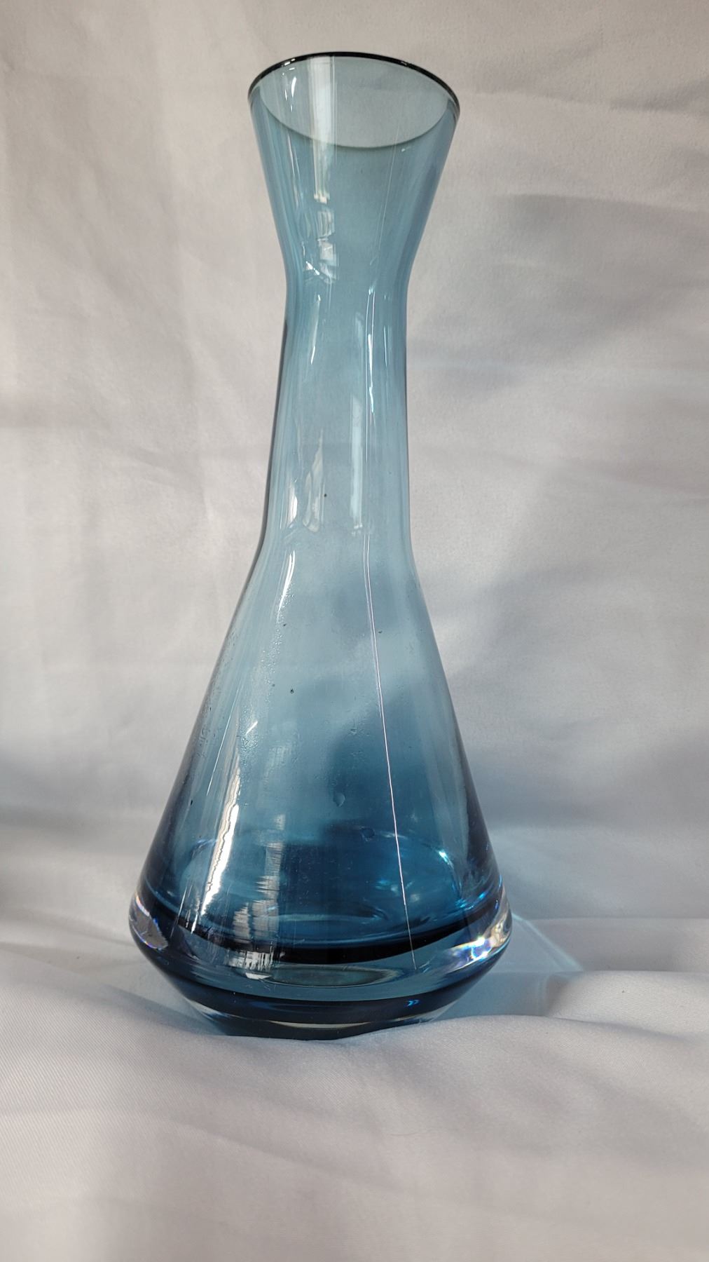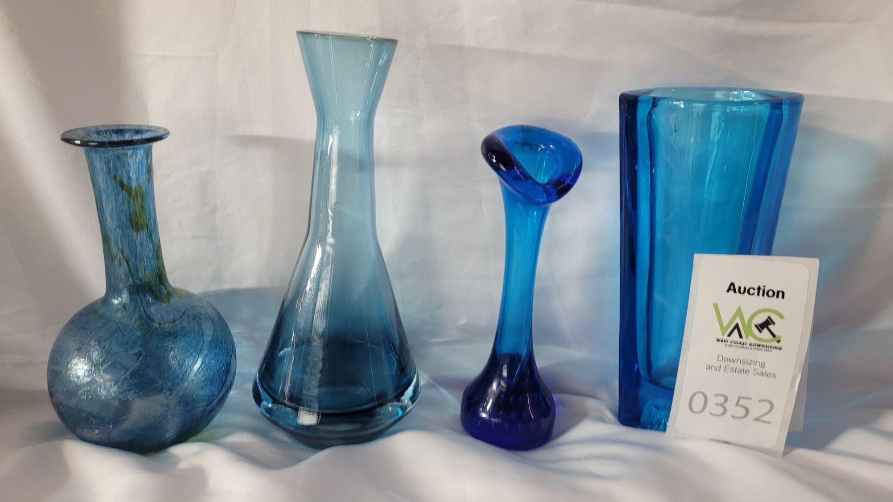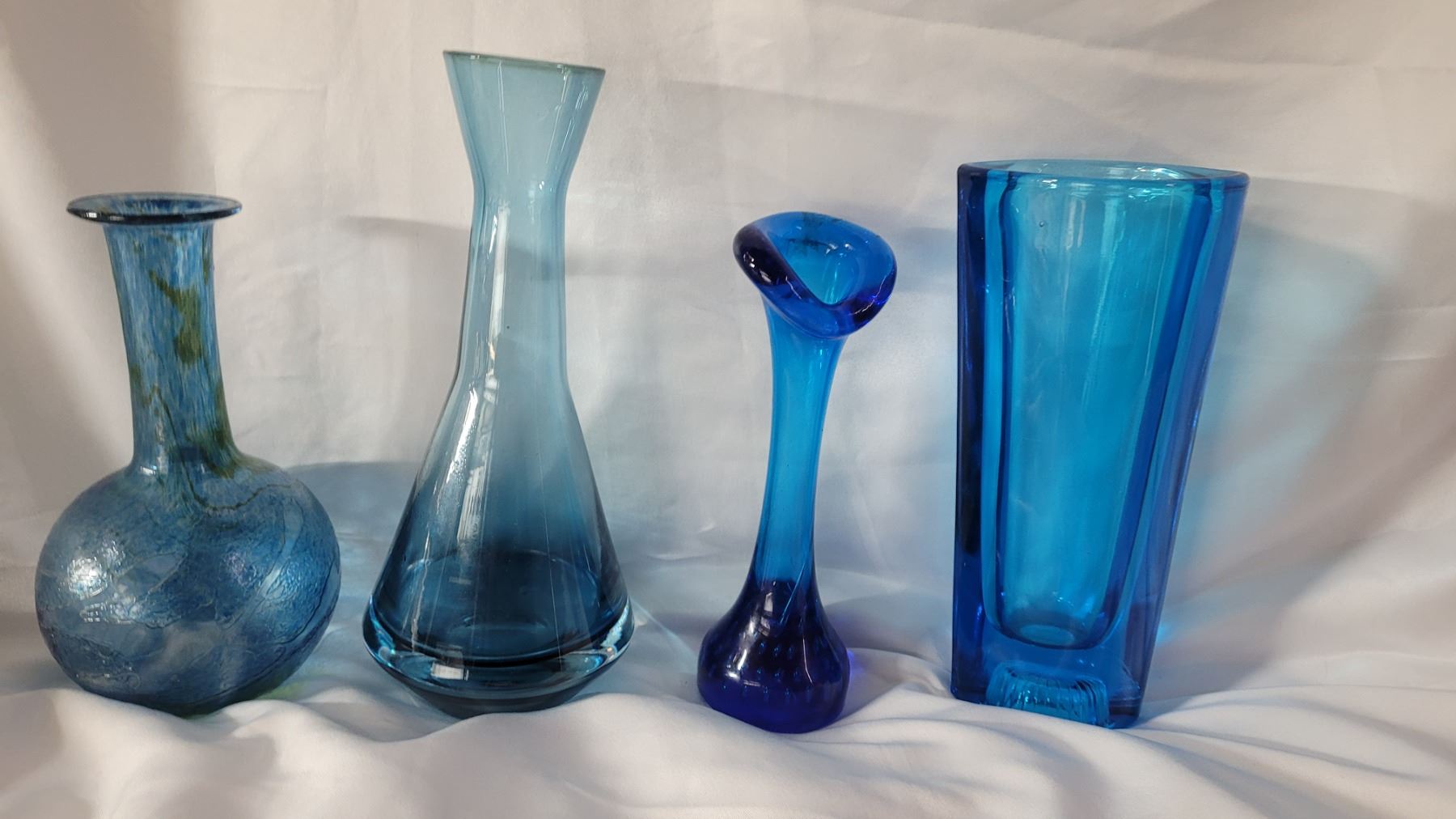 4 x blue glass vases, tallest is 9" Pickup at 9 am