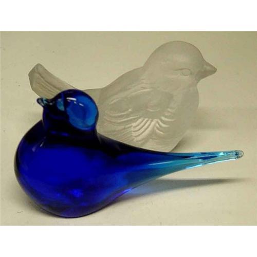 Blue Glass and Frosted Glass Bird Paperweights. SIZE: 5" l and 4" l. CONDITION: Good.