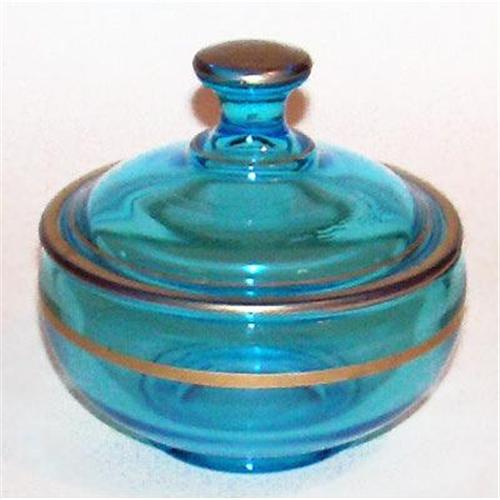 <tr><td>Title:Blue & Gold Depression Glass Powder Jar</td></tr>