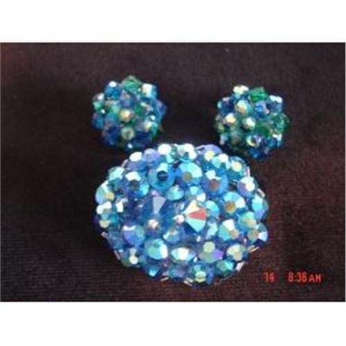 Here is a incredibily awsome blue and green aurora borealis brooch and earrings set. The earrings are different styled clipped, one that you dont see very often, Fine quality, probably one of the high end designers work! Excellent condition