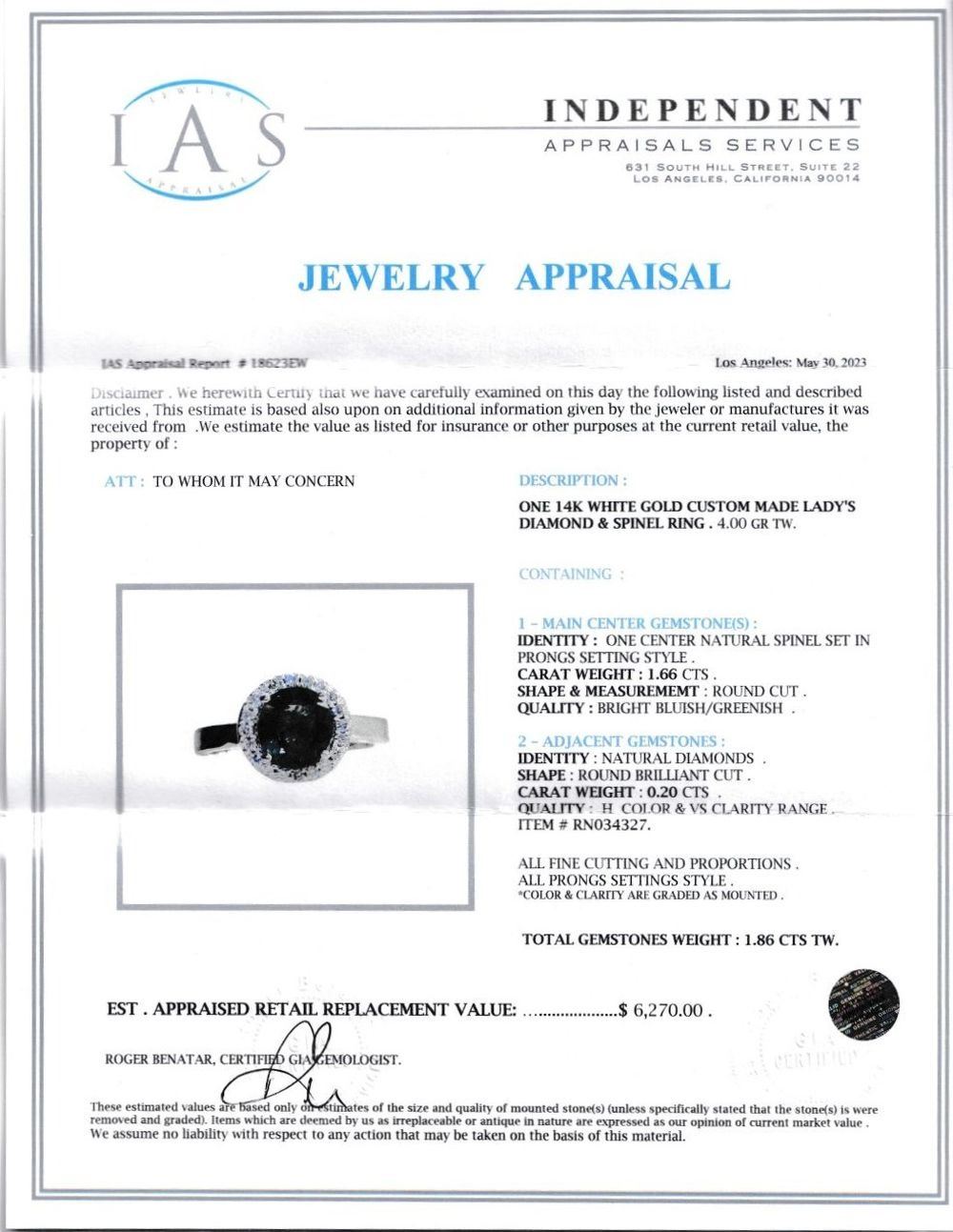 Genuine Spinel and Earth-Mined Diamond Ring.& nbsp; The 1.66 carat round cut, bright blue-greenish natural spinel is prong-set in a 14 karat white gold ring with .20 carats of round, brilliant-cut, H color, VS clarity diamonds in the floating halo. The ring is US size 6 and has an approximate 2.4 mm shank that rises to the top of the ring as cathedral-style shoulders. This ring can be resized for an additional $100, please allow an additional 10 days for shipping if we resize it. This ring is certified and appraised for $6,270.00 estimated retail replacement value.