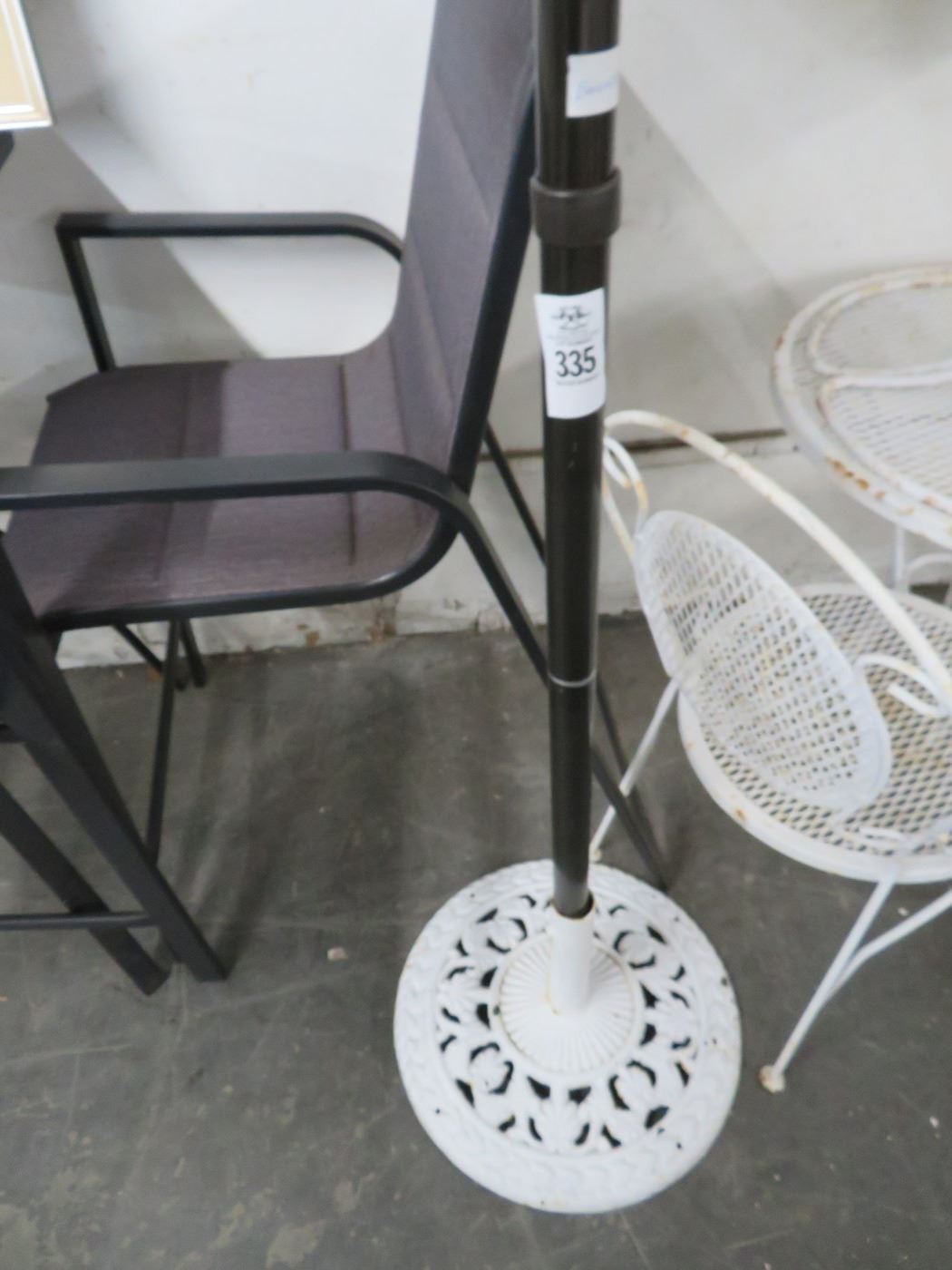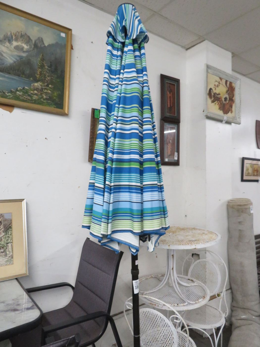 Blue/Green Striped Umbrella w/Ornate Cast Base