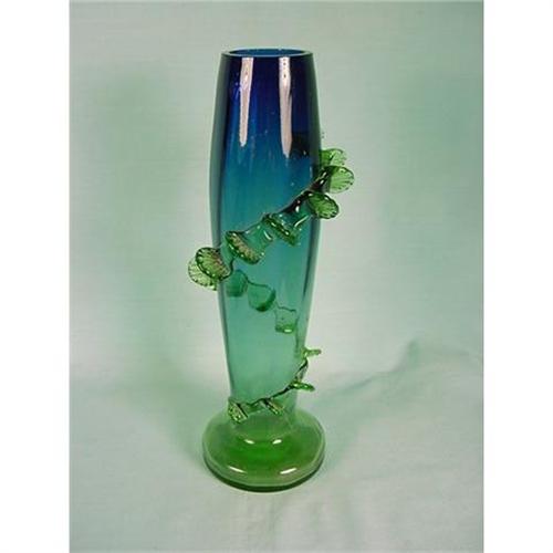 8 1/2 inch Tall Cylindar Vase ** Free Blown ** Ground Pontil ** Green at Base Shading to Dark Blue at the Top ** Inverted Panels with Rigaree Decoration ** Typical of Stevens and Williams ** Excellent Condition