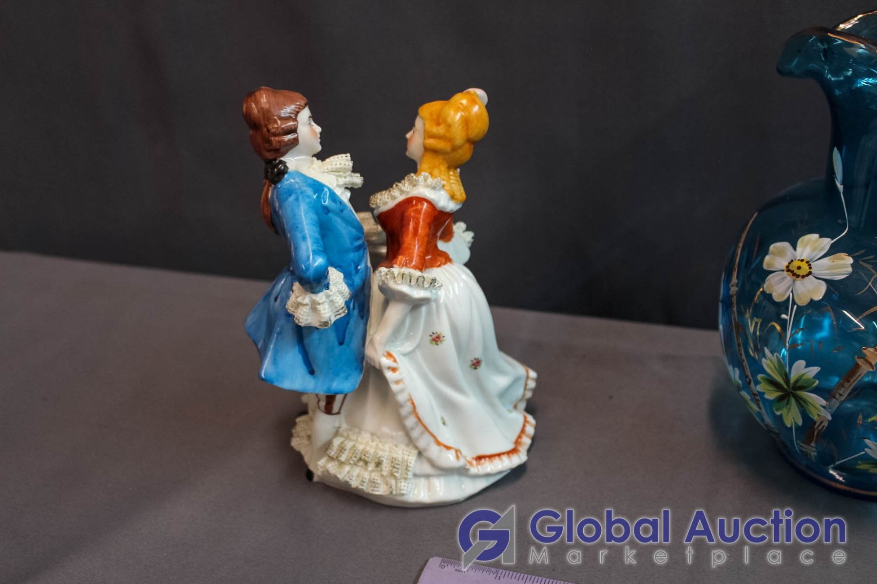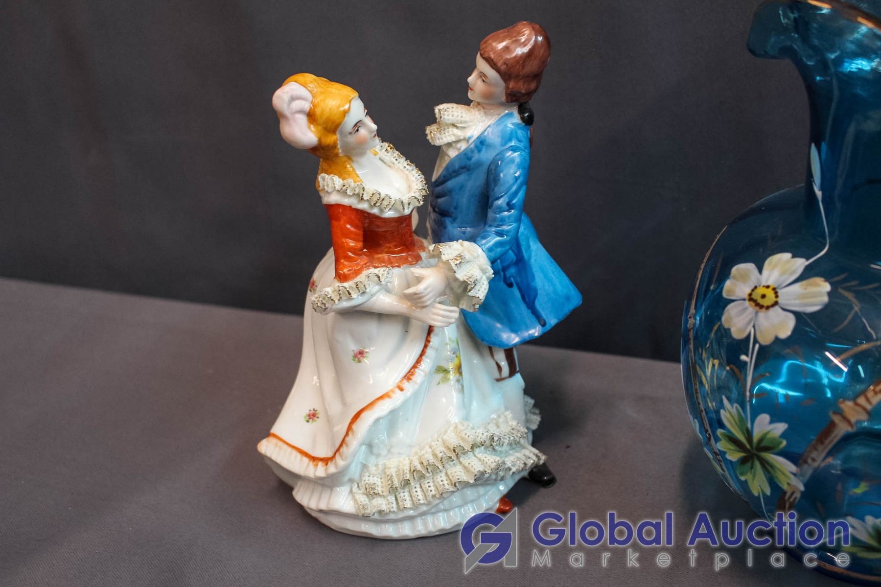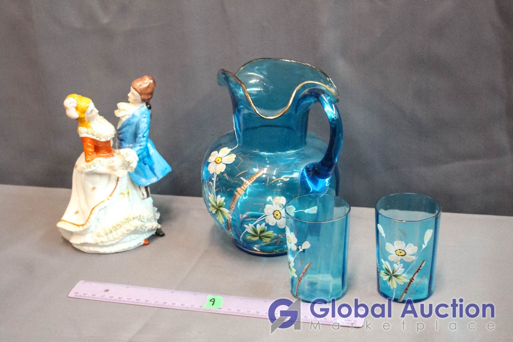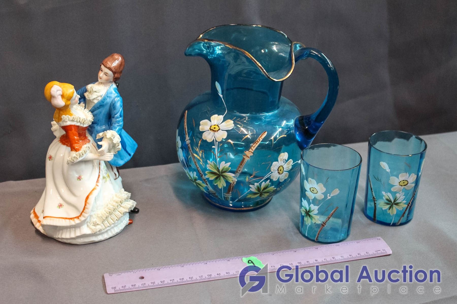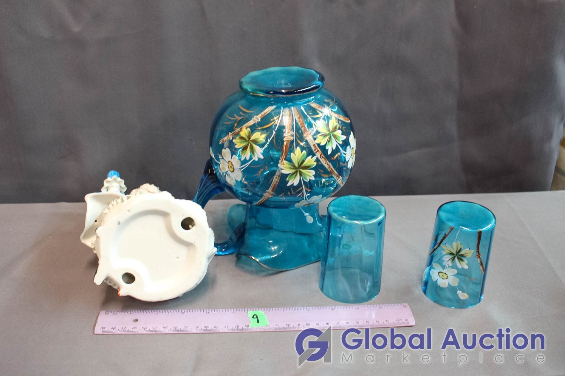 Blue Hand Painted Victorian Water Set W/ Figurine
