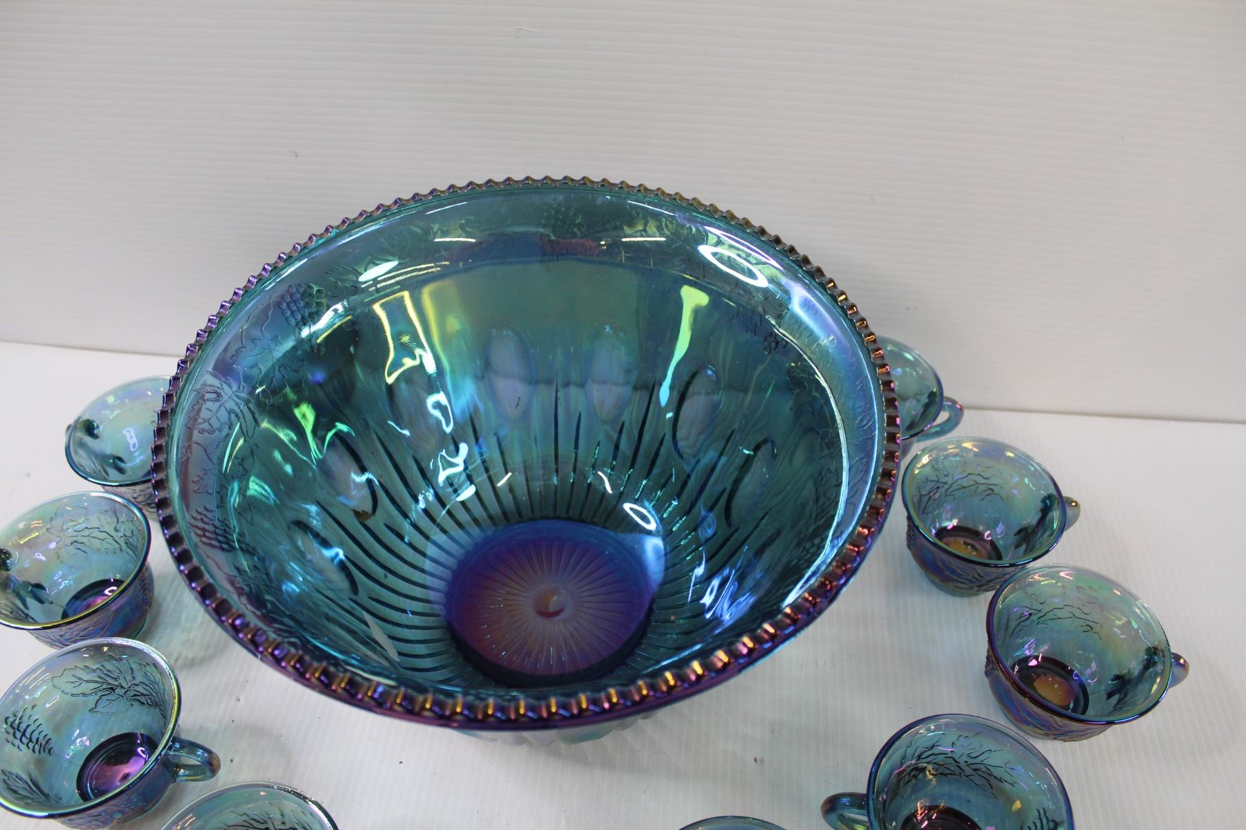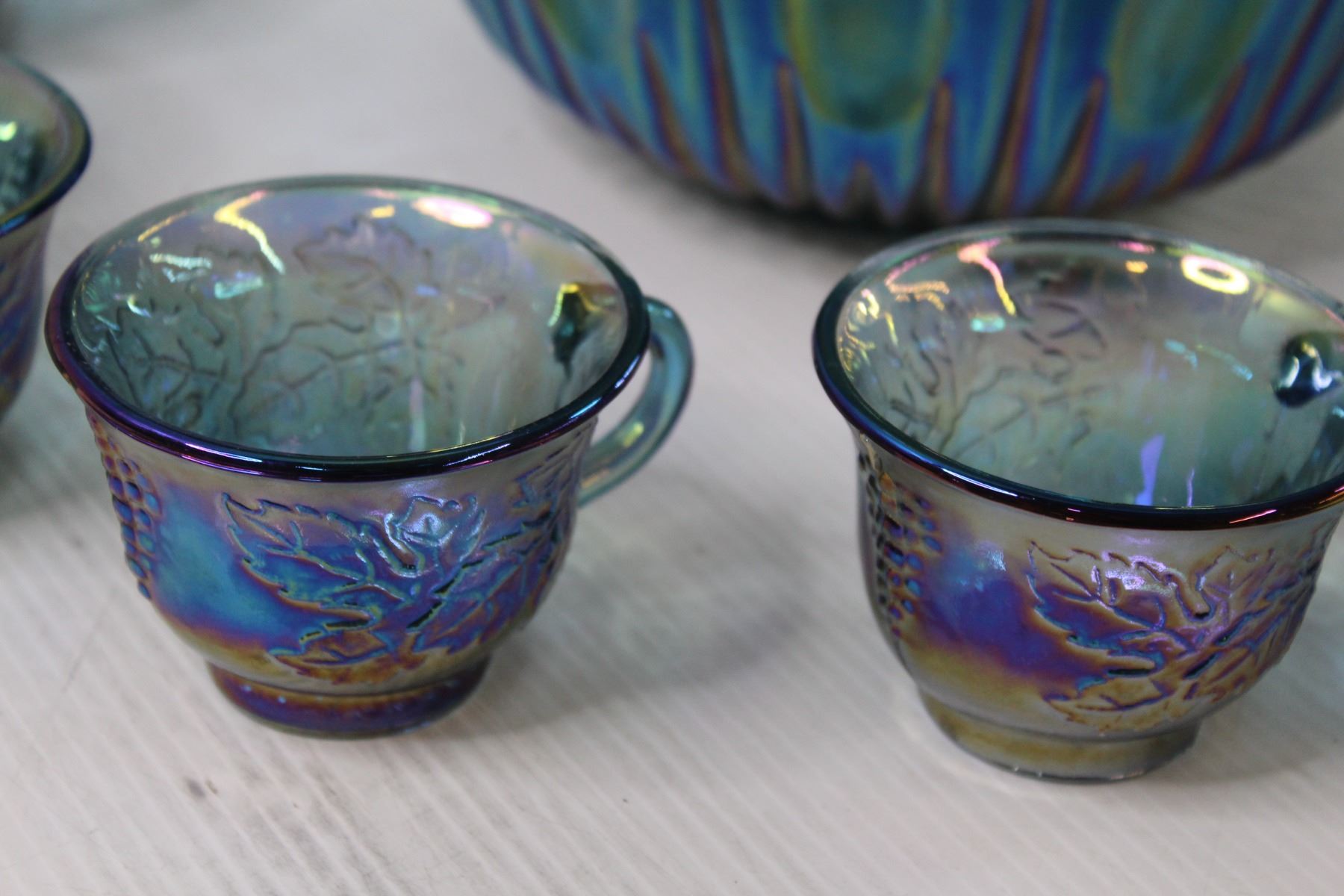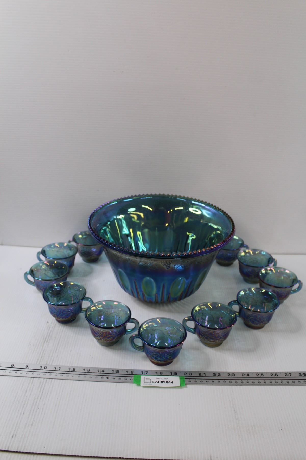 Blue Iridescent Carnival Glass Punch Bowl & Cups Set - (11 Cups)