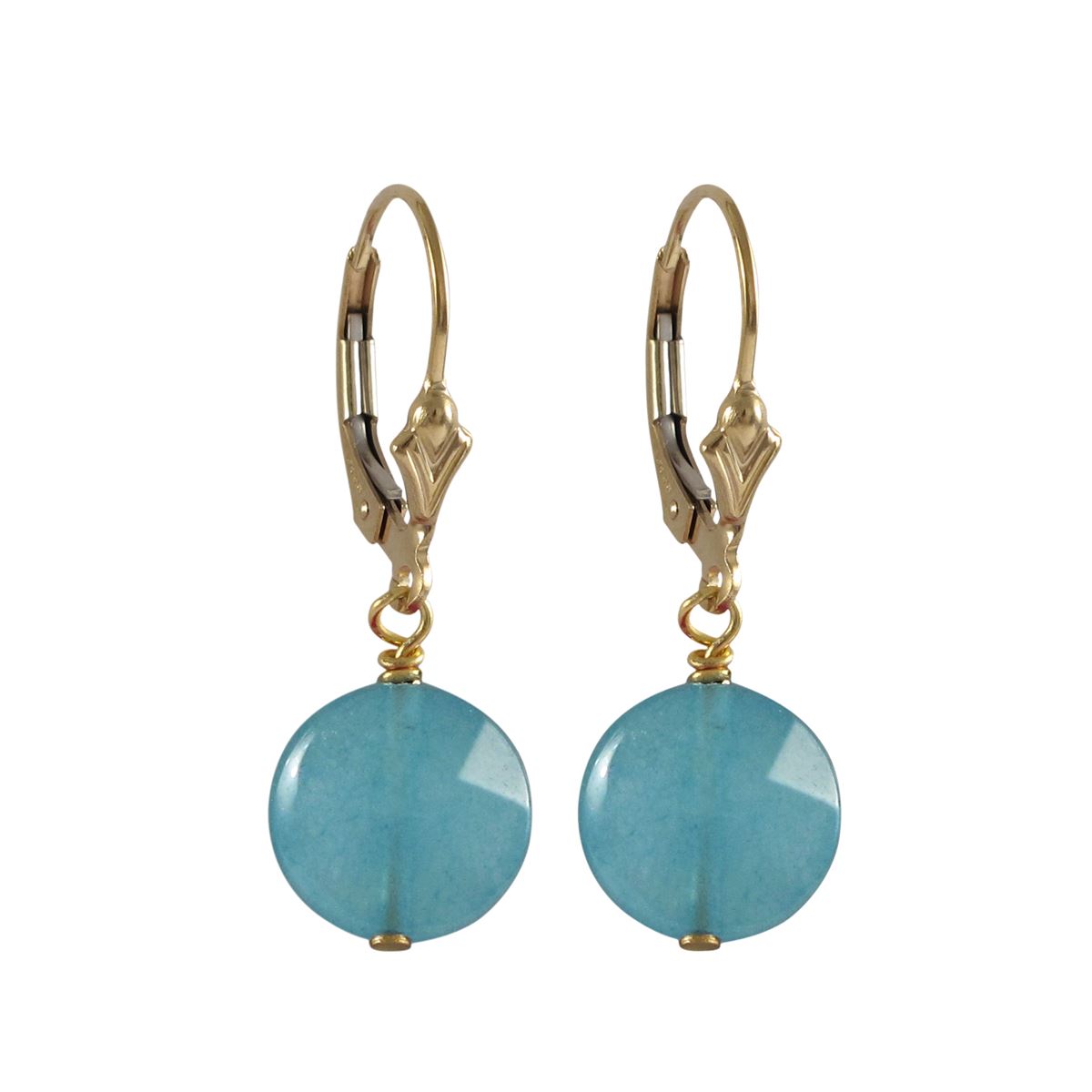 Blue Jade Semi Precious 10Mm Round Flat Stone On Gold Filled Lever Back Earrings, 1.18"