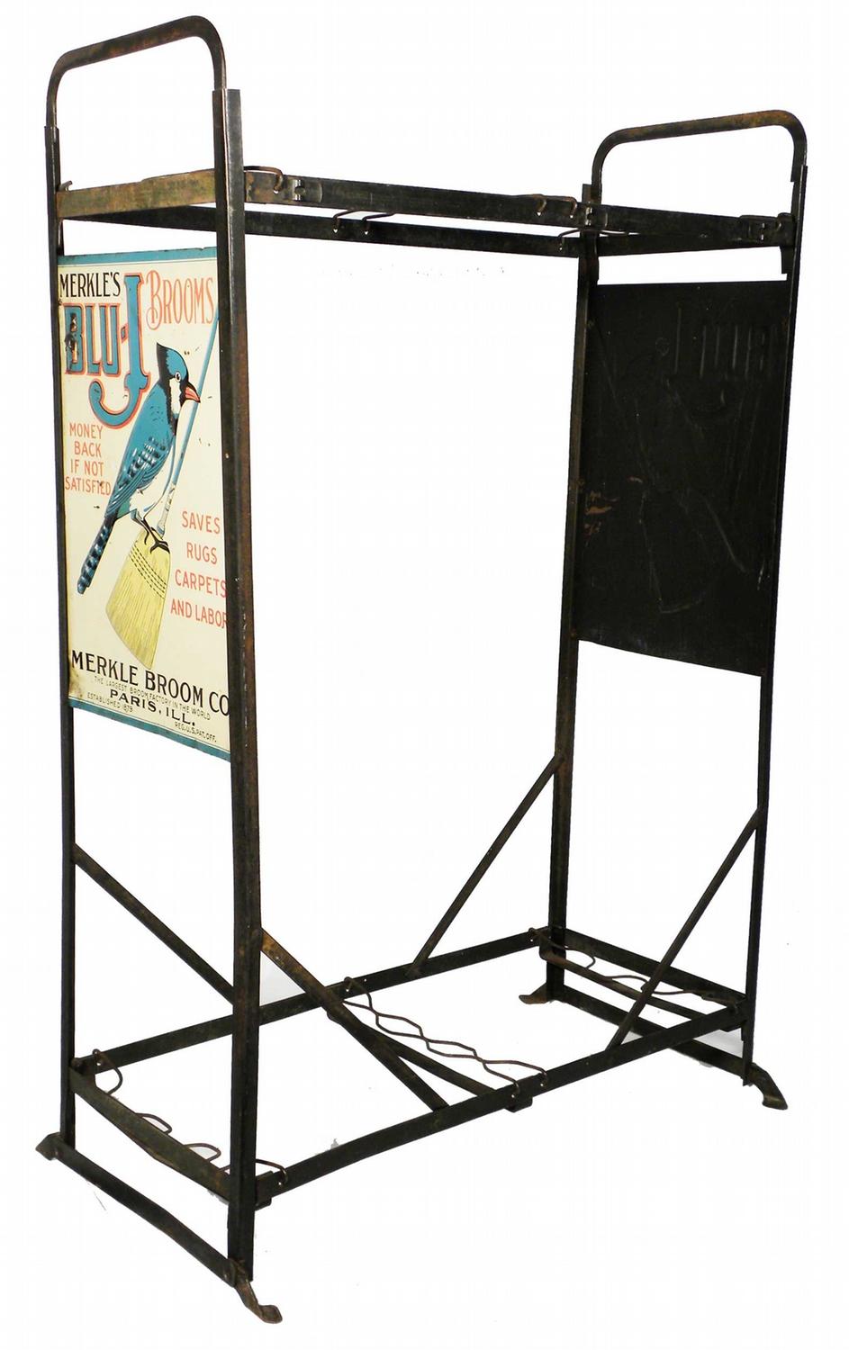 Blue-Jay Brooms Store Display. Embossed tin litho on both sides. Comes with an original Blue-Jay Broom label. Some minor rust spots otherwise good condition. 23 1/2 X 35 X 10 inches.