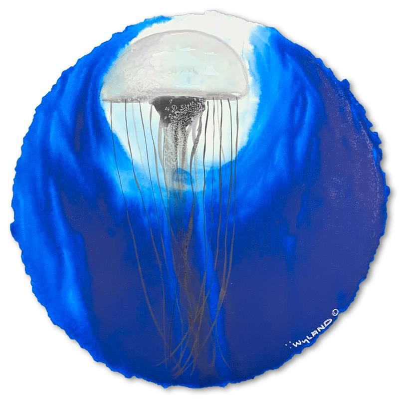 "Blue Jellyfish Rising" is an original painting, watercolor on deckle edge paper by Wyland. Hand signed by the artist, the piece comes custom framed and with a letter of authenticity. Measures approximately 30" x 30" (framed), 19.5" x 19.5" (image).