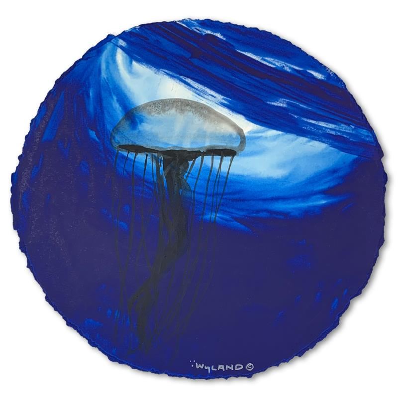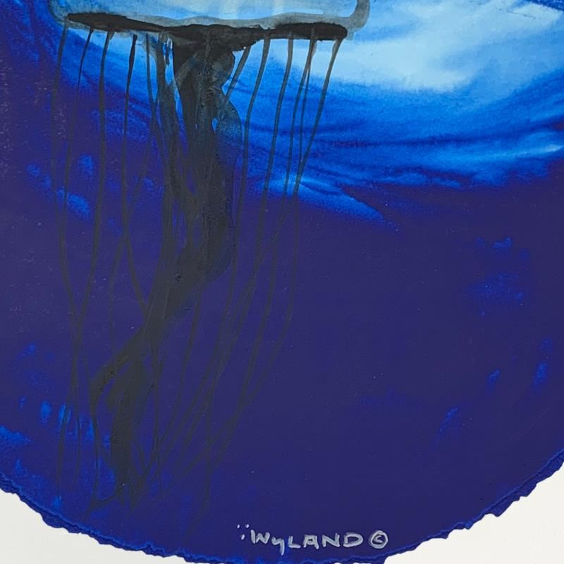 "Blue Jellyfish Rising" is an original painting, watercolor on deckle edge paper by Wyland. Hand signed by the artist, the piece comes custom framed and with a letter of authenticity. Measures approximately 30" x 30" (framed), 19.5" x 19.5" (image).