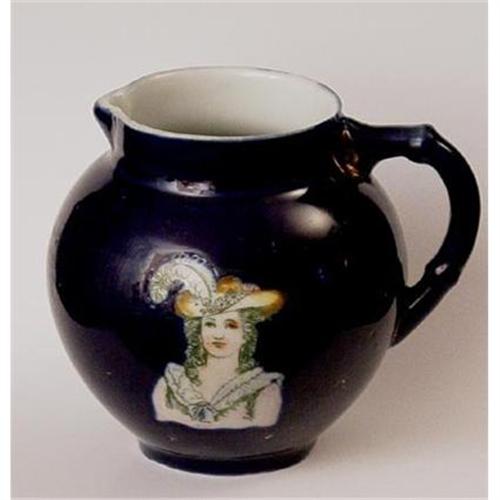 Lovely antique blue jug decorated with the image of a lady wearing a plumed hat. Hand-written number 38 in red on the underside. In good used condition with minor restoration. Please ask questions, request additional photos and shipping costs before buying.