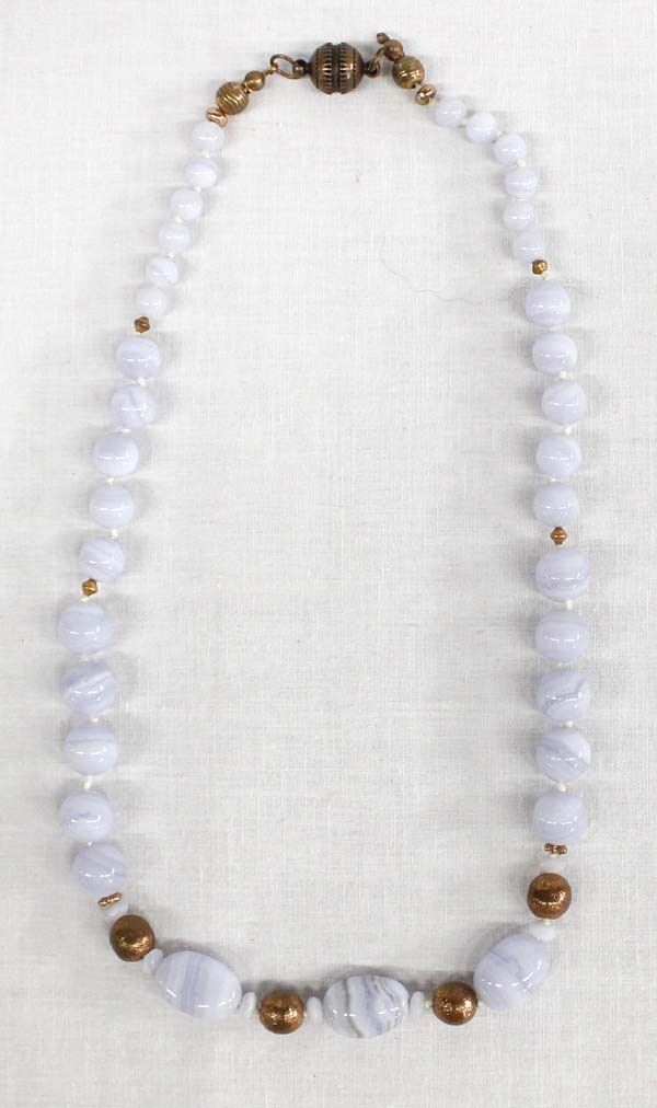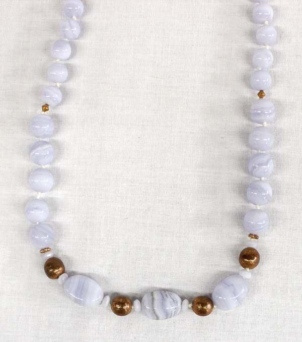 Blue Lace Agate Necklace, measures 18.5''L end to end, magnetic closure, copper accent beads, largest bead measures .75'' x .5'', lovely colors