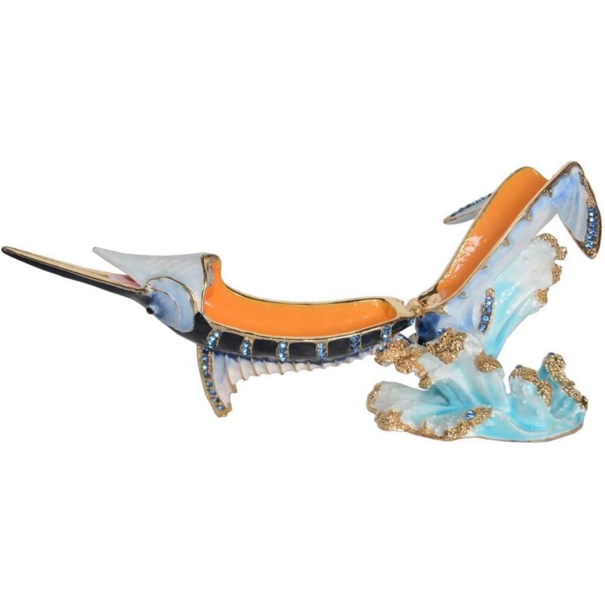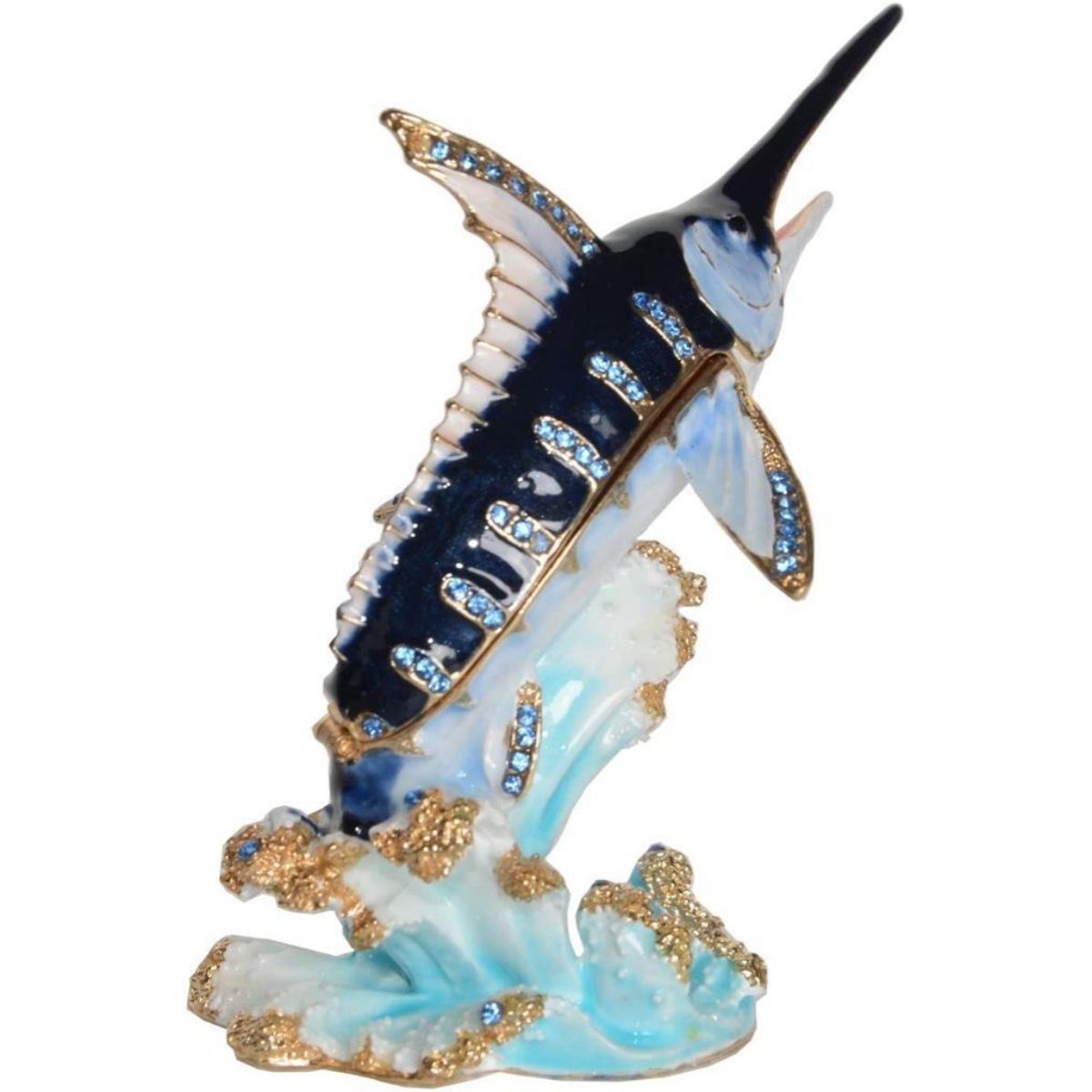 Little Blue Marlin sport fish in waves, jewel trinket box. Enamel & gilt over pewter, with embedded Austrian crystals. The fish lifts up on a hinge, with magnetic closure, to reveal an enameled interior for storing trinkets of jewels. Comes with gift box. 4" H X 2 1/4" W X 3 1/4" L.
