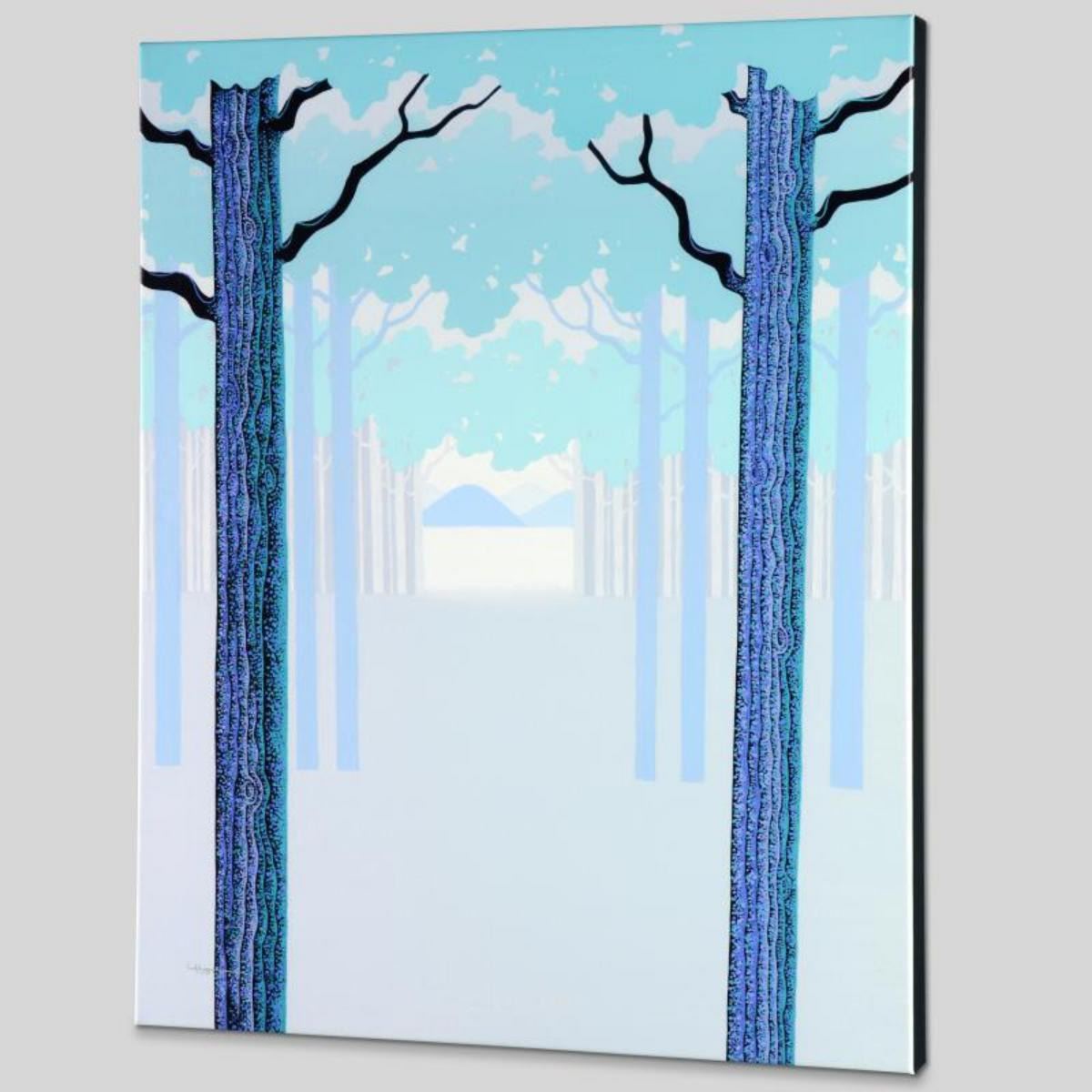 Larissa Holt, a student of distinguished artist Eyvind Earle (1916-2000), uses bold colors and breathtaking scenery to create images of Nature in her own unique style. "Blue Morning" is a limited edition giclee on stretched canvas by Holt, numbered and bearing Holt's authorized signature. This piece comes gallery wrapped. Includes Letter of Authenticity. Measures approx. 21.5" x 27" x 1.5" (image). This item requires special handling and may have a longer than usual turnaround. Reference #: 237443.