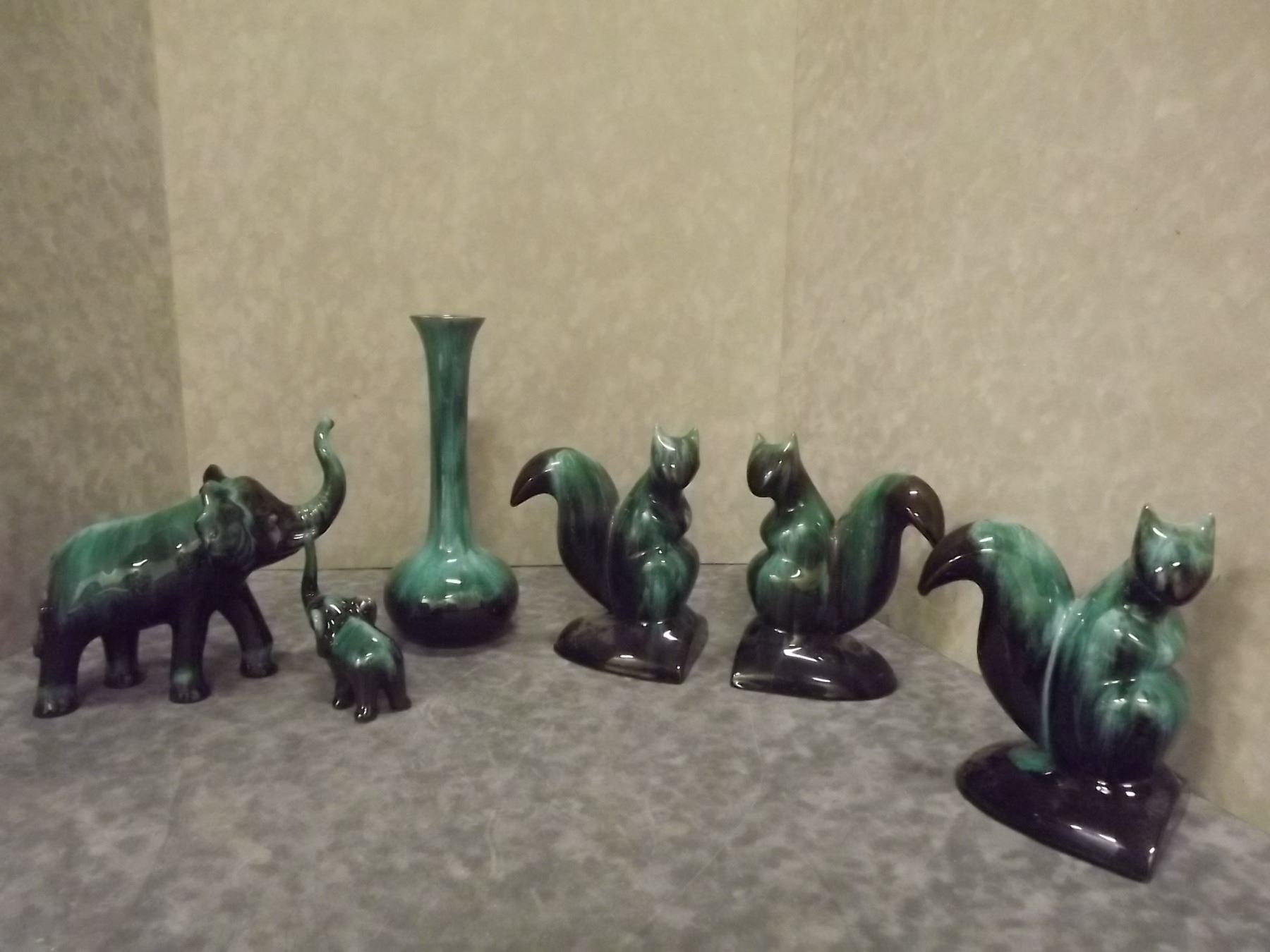 Mama & baby elephants, 3 squirrel bookends, & tall vase