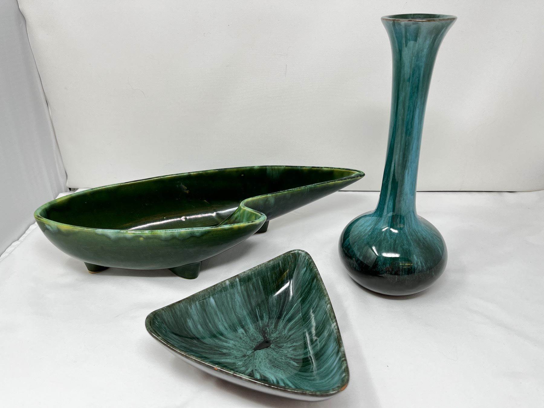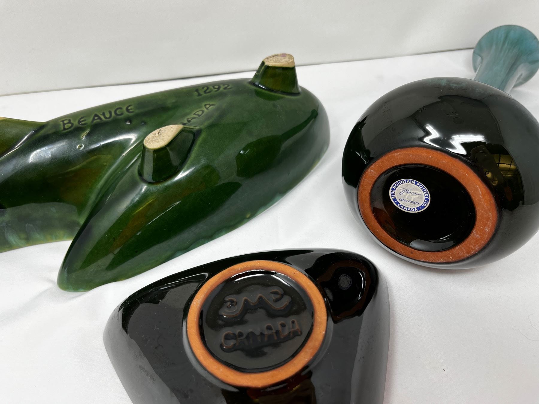 Beauce 1292 bowl with two blue mountain pottery pieces including vase and bowl.