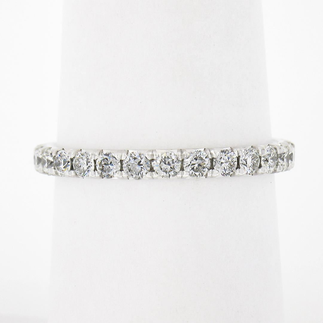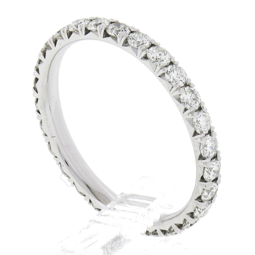 A solid platinum eternity band ring by Blue Nile, featuring 27 round cut natural diamonds (G/H - VS1/VS2 ; 1.08ctw). The ring is size 7.5, weighs a total of 2.89 grams, and measures 2.4mm wide.