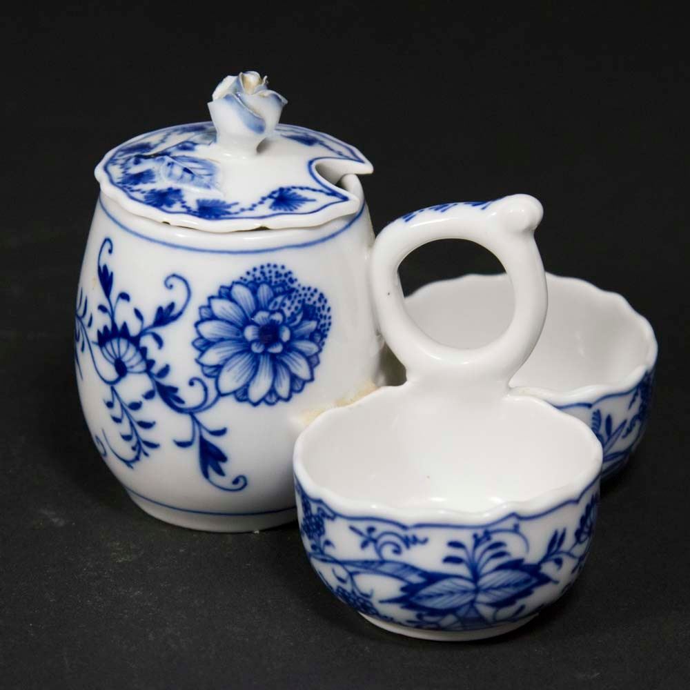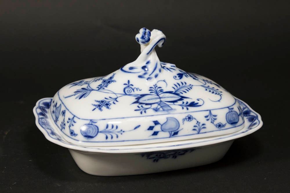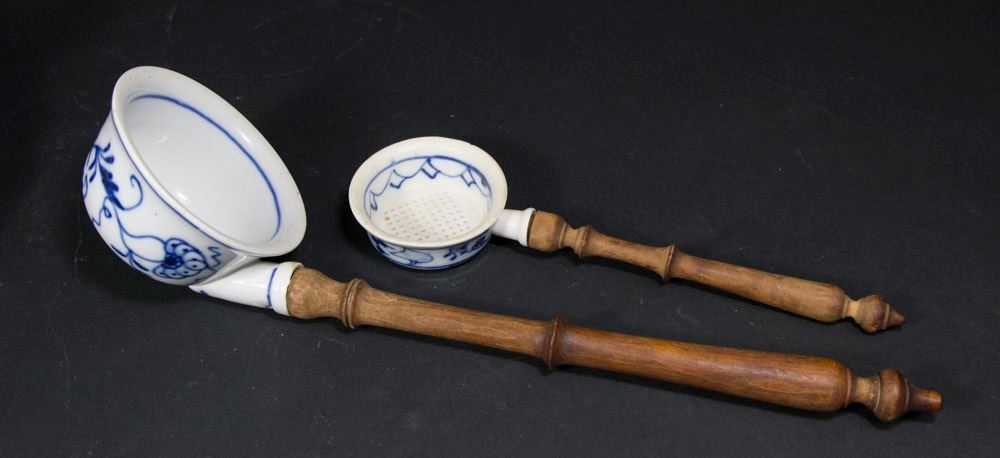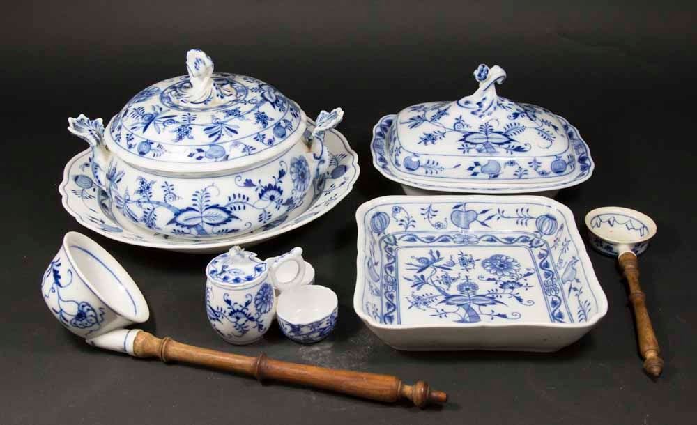 Including 2 covered tureens, approx. 7" x 10 1/2" and 6" x 9" x 7"; plate, approx. 12" D; bowl, approx. 12" H x 8" x 8 1/2"; large ladle with wood handle, approx. 13" L, unmarked; small condiment, unmarked; and tea strainer with wood handle, app. 9 1/2"L unmarked Good Condition