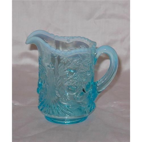 Blue opalescent pitcher with 3 sets of cherries or apples in a wreath. Opalescence is on rim and handle. Buyer pays shipping and handling costs.