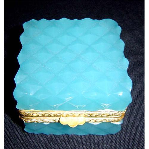 Unusual form and scale. Diamond cut glass. Bronze hinge. Not a reproduction. In pristine condition. </td></tr><tr> <td> </td></tr><tr> <td>Reference #: JBD233</td></tr><tr><td>Condition:Excellent</td></tr><tr><td>Year:1900</td></tr><tr><td>Country:France</td></tr><tr><td>Height:1.75</td></tr><tr><td>Depth:2.50</td></tr><tr><td>Width:2.50</td></tr><tr><td>Title:Blue Opaline Hinged Box</td></tr><tr><td>Type:Box</td></tr><tr><td>Location:New York USA</td></tr></table>