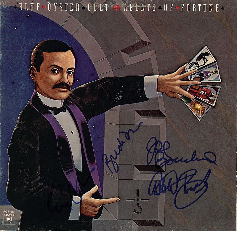 Agents of Fortune album signed on the front cover in blue felt tip by Eric Bloom, Joe Bouchard, Albert Bouchard, and Buck Dharma. In fine condition, with some light wear to the cover. The record is included.