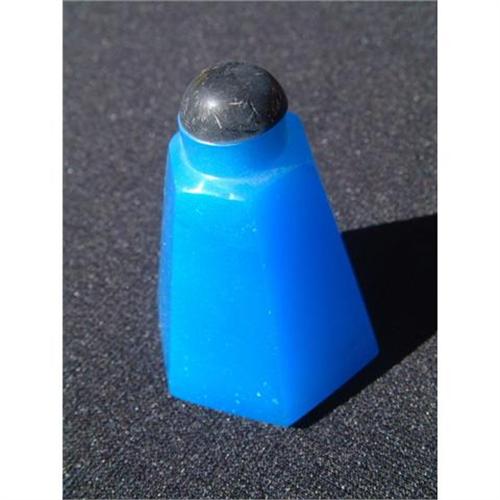 Blue Peking glass snuff bottle with a geometric design. A black color Peking glass stopper complements this exquisite pate du verre art glass snuff bottle. Length: 2.8" (7 cm.). Estimated retail value: $650.