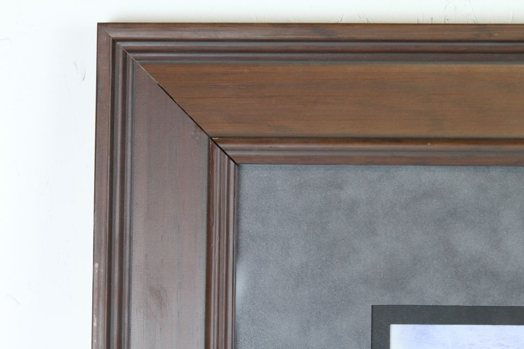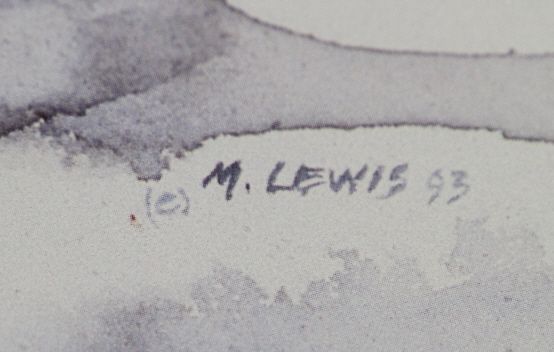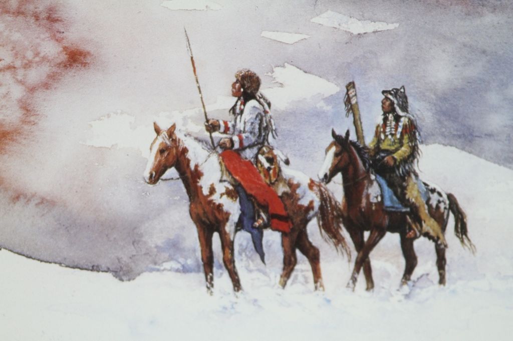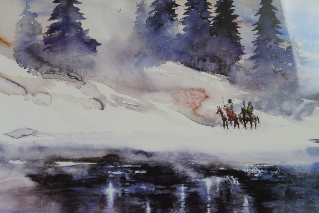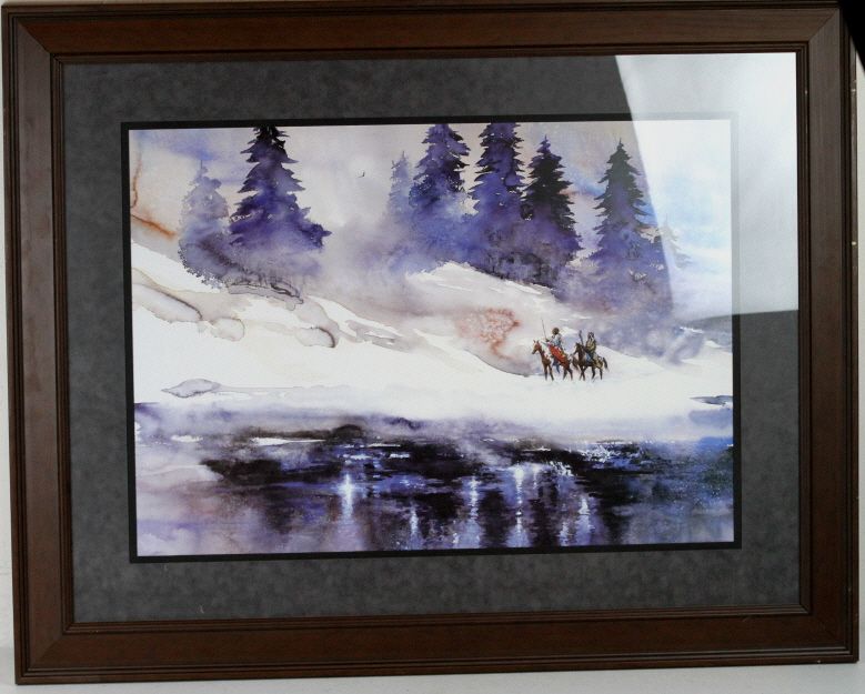 "Blue Pine Ridge" by M. Lewis - This is from 2003 and is a Watercolor painting depicting two Native Americans on horseback along a snowy river. Measures 31"x39.25"