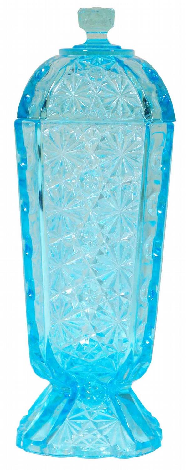 Blue Pressed Glass Straw Holder. Daisy and button design. No chips or cracks. 11 inches tall.