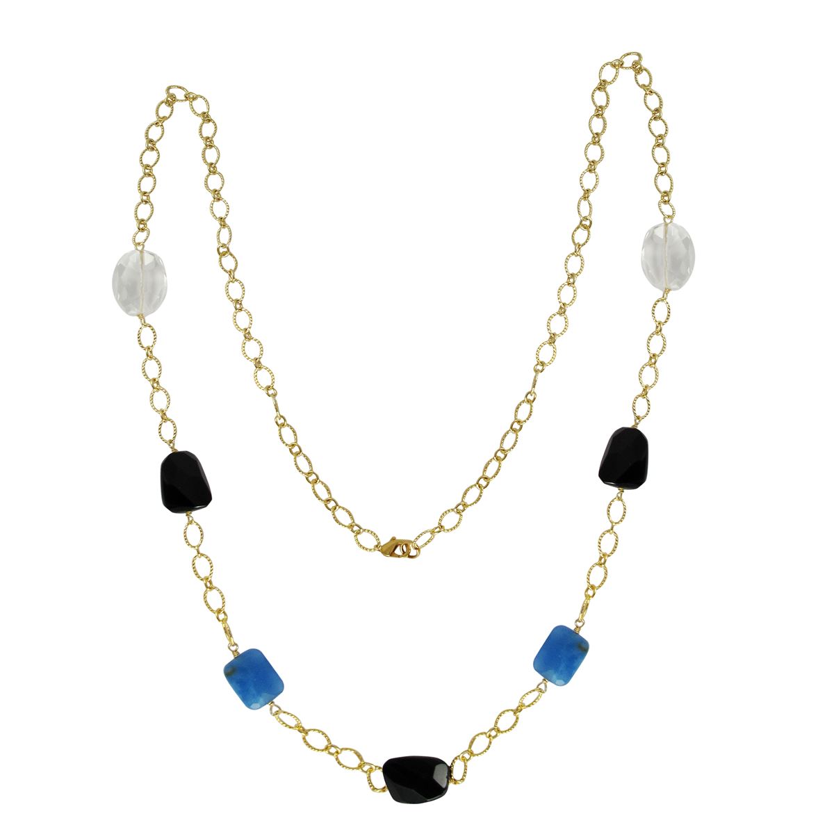 Blue Quartz And Black Combination Semi Precious Stones On Gold Plated Brass Chain, 36"