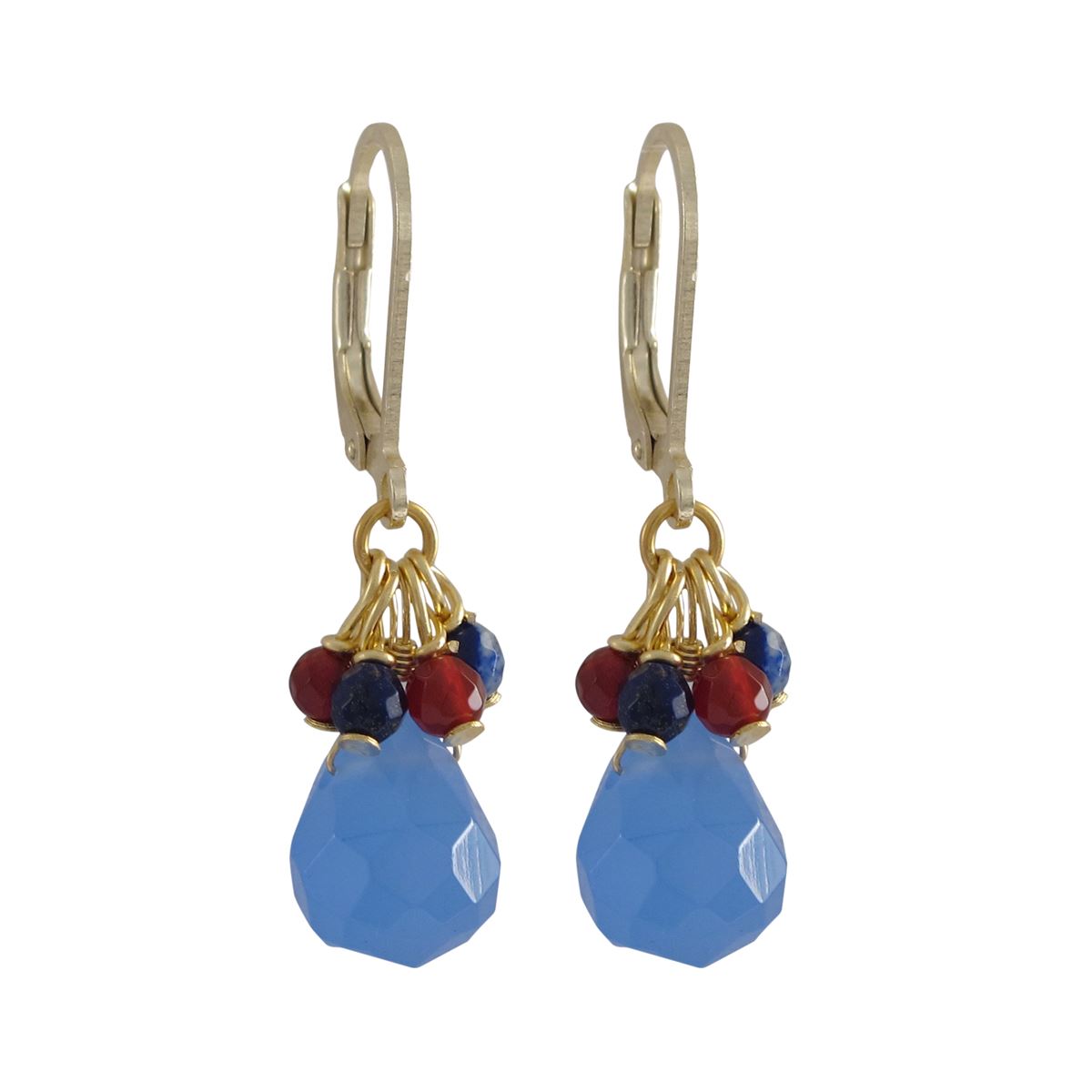 Blue Quartz Combination Semi Precious Stones, On Gold Plated Sterling Silver Lever Back Earrings, 1.42"