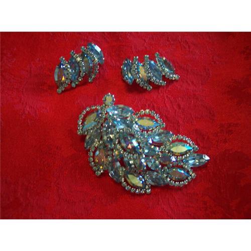 Simply Gorgeous set.Pin is designed to look like three layers.Measures 2 3/4" across.Earrings are clip and measure 1 1/4" long.There is no makers mark on this set but would say a high end piece.All stones set in prongs.Gorgeous light blue irridescent color.Perfect condition.