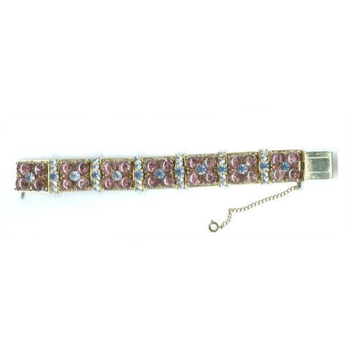 Blue Rhinestones between the Glass Amethist-colored Beads on this goldtone bracelet.Not signed. Beautiful item and good condition