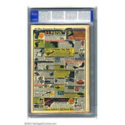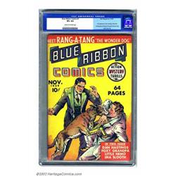 Blue Ribbon #1 (MLJ, 1939) CGC VF+ 8.5 Cream to off-white pages. Historic in many ways, most notably as the first MLJ (later renamed Archie Publications) comic, this issue also introduced Dan Hastings, Richy the Wonder Boy, and Rang-A-Tang the Wonder Dog. Jack Cole contributes art for multiple stories, and Will Eisner can be found on the "Boodini the Great" feature. This copy appears even nicer at first glance, with only minor blemishes on the back keeping the book from grading even higher. Overstreet 2002 VF 8.0 value = $2,083. Important notice: We expect to be auctioning lots at the rate of 200-250 per hour. Sometimes eBay Premier live bid software cannot keep up with that pace, so we strongly recommend that you place a realistic proxy bid now as insurance to avoid disappointment. Also please note that all Heritage/CAA lots purchased through eBay Premier carry a 20% Buyer's Premium. Please make sure you read the Terms and Conditions.