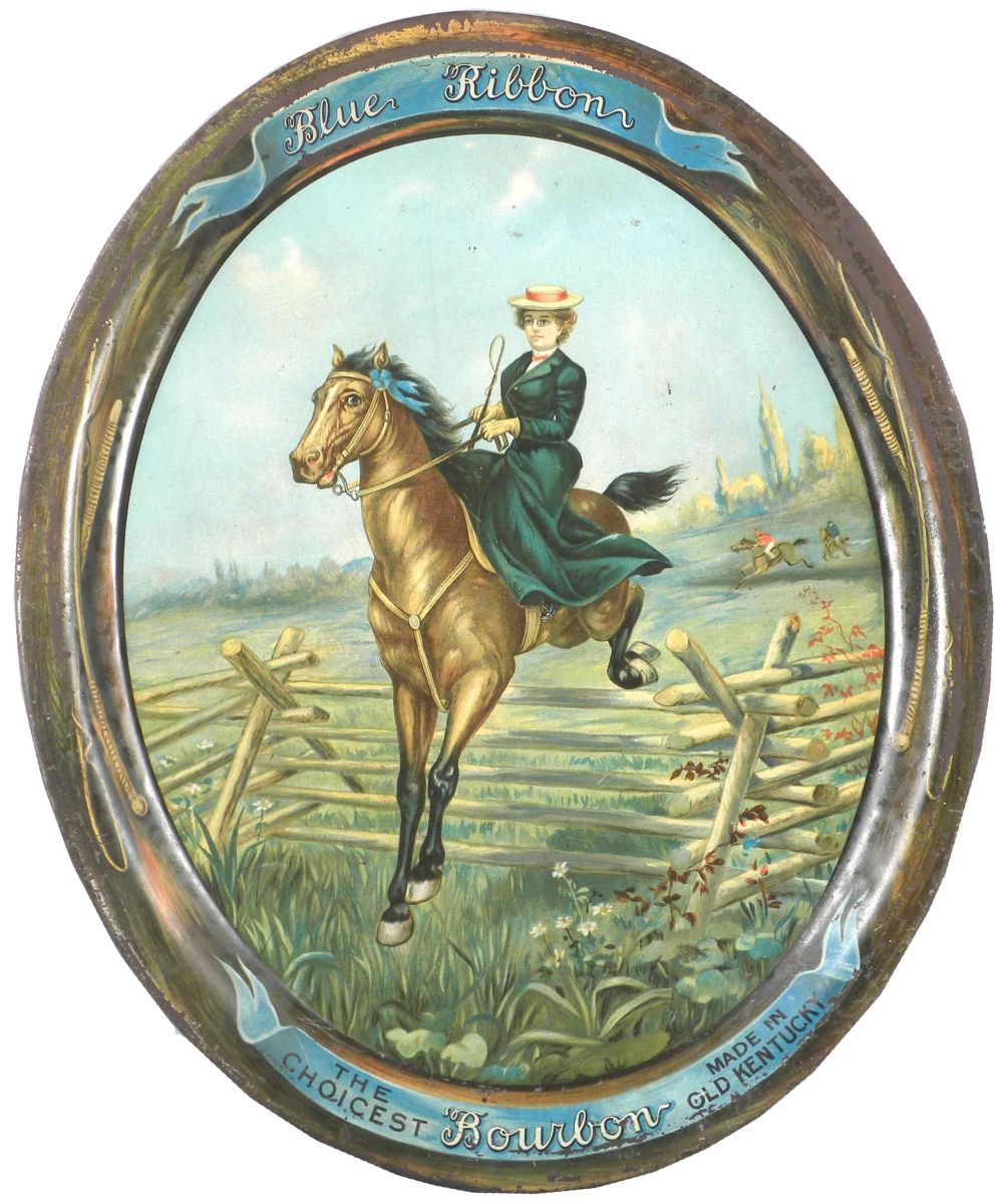 Blue Ribbon Bourbon Tin Serving Tray. Made in Old Kentucky. Depicts equestrian scene. Some significant edge ware otherwise good condition. 14 X 17 inches.