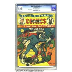 Blue Ribbon Comics #11 (MLJ, 1941) CGC VG 4.0 Off-white to white pages. Charles Biro and Mort Meskin art. Overstreet 2003 VG 4.0 value = $204. Important notice: Heritage usually auctions material at the rate of 200-250 lots per hour. On some occasions eBay Live bid software or the Internet may not be able to keep up with the pace of the auction. We recommend placing a realistic absentee bid now as insurance to avoid disappointment. Occasionally the auctioneer may eliminate or reject an eBay Live bid, and the auctioneer may also reopen a lot after the close of the eBay live bidding (usually because we missed an audience bid), and may reject your bid even if it shows you as the winning bidder. By bidding via eBay Live, you agree that Heritage may award the lot to another bidder at its sole discretion under the circumstances described above or any other reasonable circumstances. Since eBay bids are not shown to us until we open the lot on the floor, we treat those bids just like floor bids. In most cases the floor responds before the eBay bid is presented to us, due to Internet lag time, so for consistency we have made it a policy that floor bids are always considered first over tie eBay live bids. Also please note that all Heritage lots purchased through eBay Live carry a 20% Buyer's Premium. Please make sure you read the Terms and Conditions before you bid.