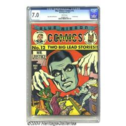 Blue Ribbon Comics #12 (MLJ, 1941) CGC FN/VF 7.0 White pages. MLJ's oldest title gets contributions from three Golden Age greats in this issue; Charles Biro, Mort Meskin, and Irv Hasen. Doc Strong makes his final appearance. Overstreet 2003 FN 6.0 value = $306; VF 8.0 value = $638. Important notice: Heritage usually auctions material at the rate of 200-250 lots per hour. On some occasions eBay Live bid software or the Internet may not be able to keep up with the pace of the auction. We recommend placing a realistic absentee bid now as insurance to avoid disappointment. Occasionally the auctioneer may eliminate or reject an eBay Live bid, and the auctioneer may also reopen a lot after the close of the eBay live bidding (usually because we missed an audience bid), and may reject your bid even if it shows you as the winning bidder. By bidding via eBay Live, you agree that Heritage may award the lot to another bidder at its sole discretion under the circumstances described above or any other reasonable circumstances. Since eBay bids are not shown to us until we open the lot on the floor, we treat those bids just like floor bids. In most cases the floor responds before the eBay bid is presented to us, due to Internet lag time, so for consistency we have made it a policy that floor bids are always considered first over tie eBay live bids. Also please note that all Heritage lots purchased through eBay Live carry a 20% Buyer's Premium. Please make sure you read the Terms and Conditions before you bid.