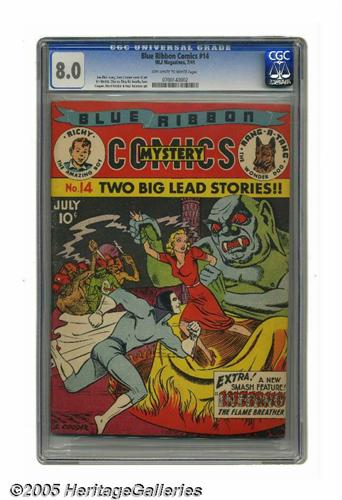 <B>Blue Ribbon Comics #14 (MLJ, 1941) CGC VF 8.0 Off-white to white pages.</B></I> Mr. Justice, a ghost who has come back from the dead to fight crime, is the cover star of this issue. And while cover artist Sam Cooper may not be a big name, the list of interior contributors includes Mort Meskin, Irv Novick, Paul Reinman, and Charles Biro. This is the first time we've offered this issue, and our copy is the only one that CGC has certified to date. Overstreet 2005 VF 8.0 value = $544. CGC census 3/05: 1 in 8.0, none higher.