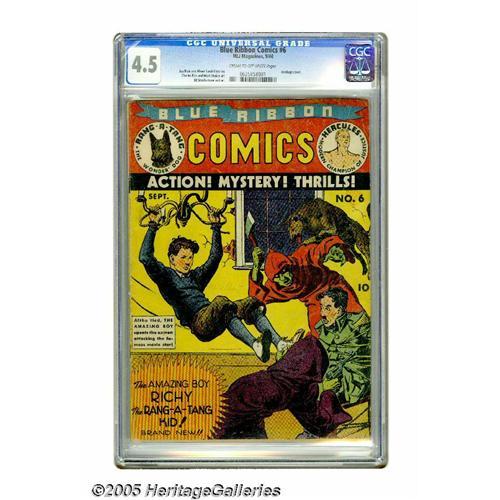 <B>Blue Ribbon Comics #6 (MLJ, 1940) CGC VG+ 4.5 Cream to off-white pages.</B></I> This is the first time we've ever seen this issue here at Heritage! The star character is Rang-A-Tang the Wonder Dog, assisting (or assisted by) his kid pal Richy Waters. That's them on the cover rescuing an unnamed ""famous movie star"" whom we take to be Charlie Chaplin! That cover was drawn by Ed Smalle; the book also has art by Mort Meskin and Charles Biro. Overstreet 2005 VG 4.0 value = $130. CGC census 8/05: 1 in 4.5, 1 higher. <BR><BR><B>Important notice:</B> Heritage usually auctions material at the rate of 200-250 lots per hour. On some occasions eBay Live bid software or the Internet may not be able to keep up with the pace of the auction. We recommend placing a realistic absentee bid now as insurance to avoid disappointment. Occasionally the auctioneer may eliminate or reject an eBay Live bid, and the auctioneer may also reopen a lot after the close of the eBay live bidding (usually because we missed an audience bid), and may reject your bid even if it shows you as the winning bidder. By bidding via eBay Live, you agree that Heritage may award the lot to another bidder at its sole discretion under the circumstances described above or any other reasonable circumstances. Since eBay bids are not shown to us until we open the lot on the floor, we treat those bids just like floor bids. In most cases the floor responds before the eBay bid is presented to us, due to Internet lag time, so for consistency we have made it a policy that floor bids are always considered first over tie eBay live bids. Also please note that all Heritage lots purchased through eBay Live carry a 20% Buyer's Premium. Please make sure you read the Terms and Conditions before you bid. This lot is being auctioned in conjunction with a live floor auction by Heritage Galleries & Auctioneers. All final auction and invoice information will be supplied by Heritage Galleries & Auctioneers, and all other information