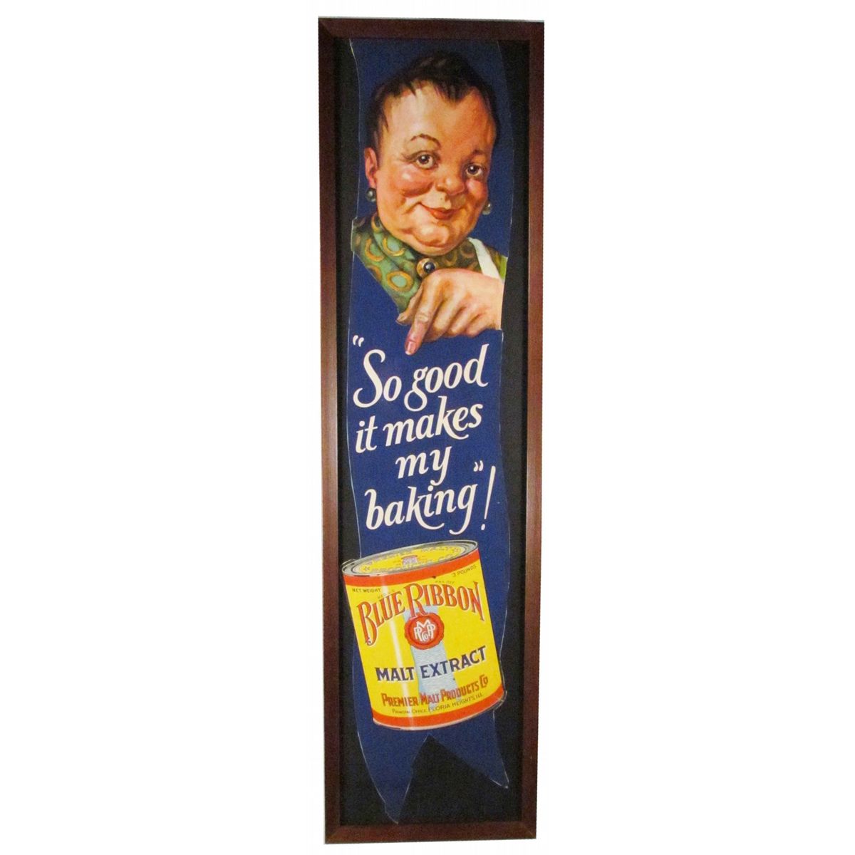 Blue Ribbon Malt Extract Paper Sign. Entitled, "So good it makes my baking". Trimmed otherwise excellent condition. Framed under glass. 11 X 41 inches overall.