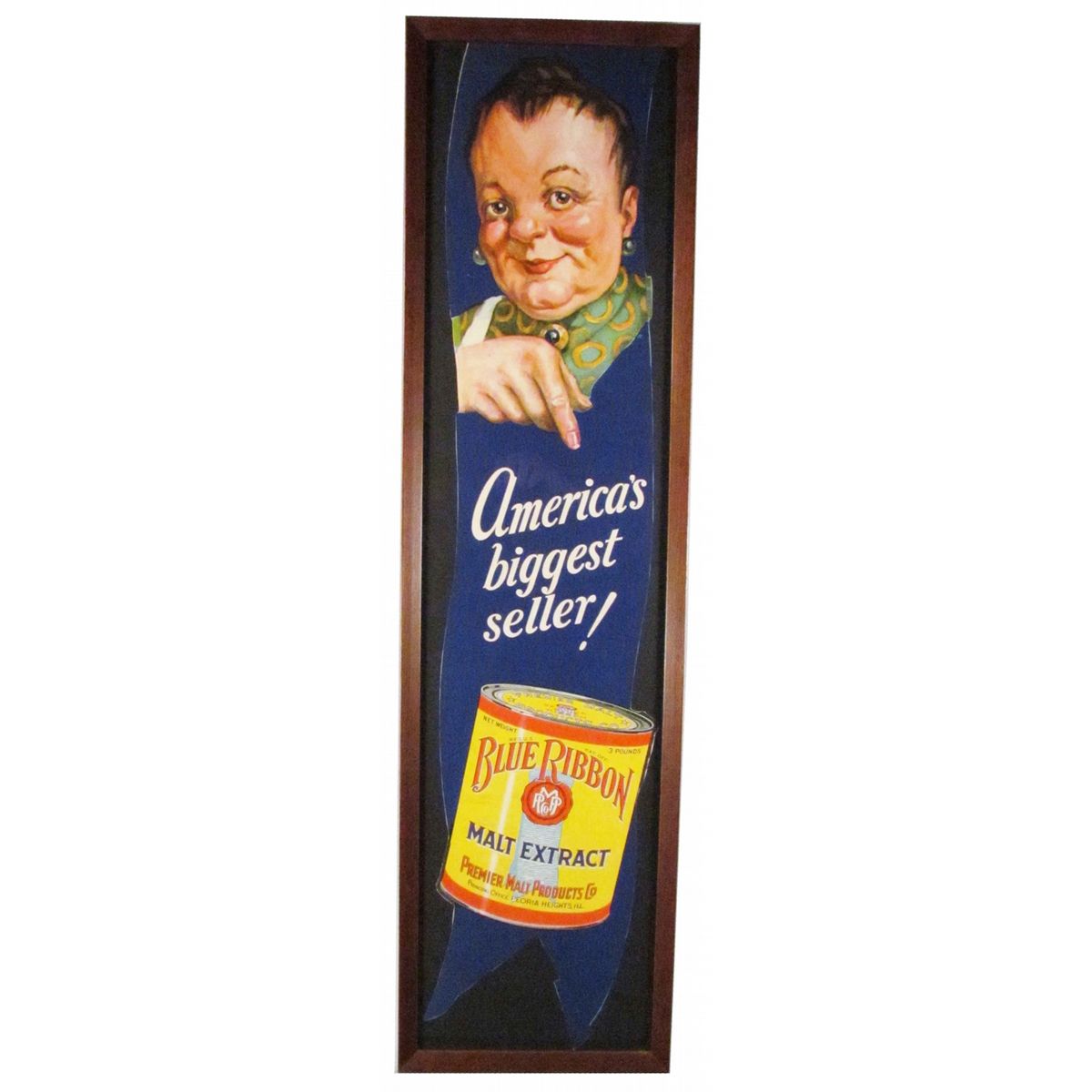 Blue Ribbon Malt Extract Paper Sign. Entitled, "America's biggest seller". Trimmed otherwise excellent condition. Framed under glass. 11 X 41 inches overall.