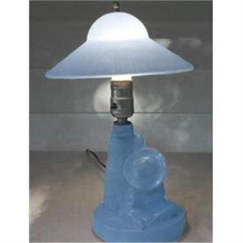 This charming fired on blue Sleeping Mexican vanity or bedside lamp features a Mexican man sleeping, Sombrero over his head, under a cactus. Measuring about 12 inches tall, described and shown on pgs 174-175 of Whitmeyer's - Bedroom & Bathroom Glassware of the Depression Years. With only minimal wear, this stunning Art Deco glass vanity, boudoir or dresser lamp and has all its original hardware. Both the shade and lamp are in excellent condition.