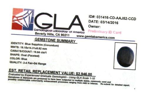 Blue Sapphire (Corundum) GLA Certified 19.64 cts.