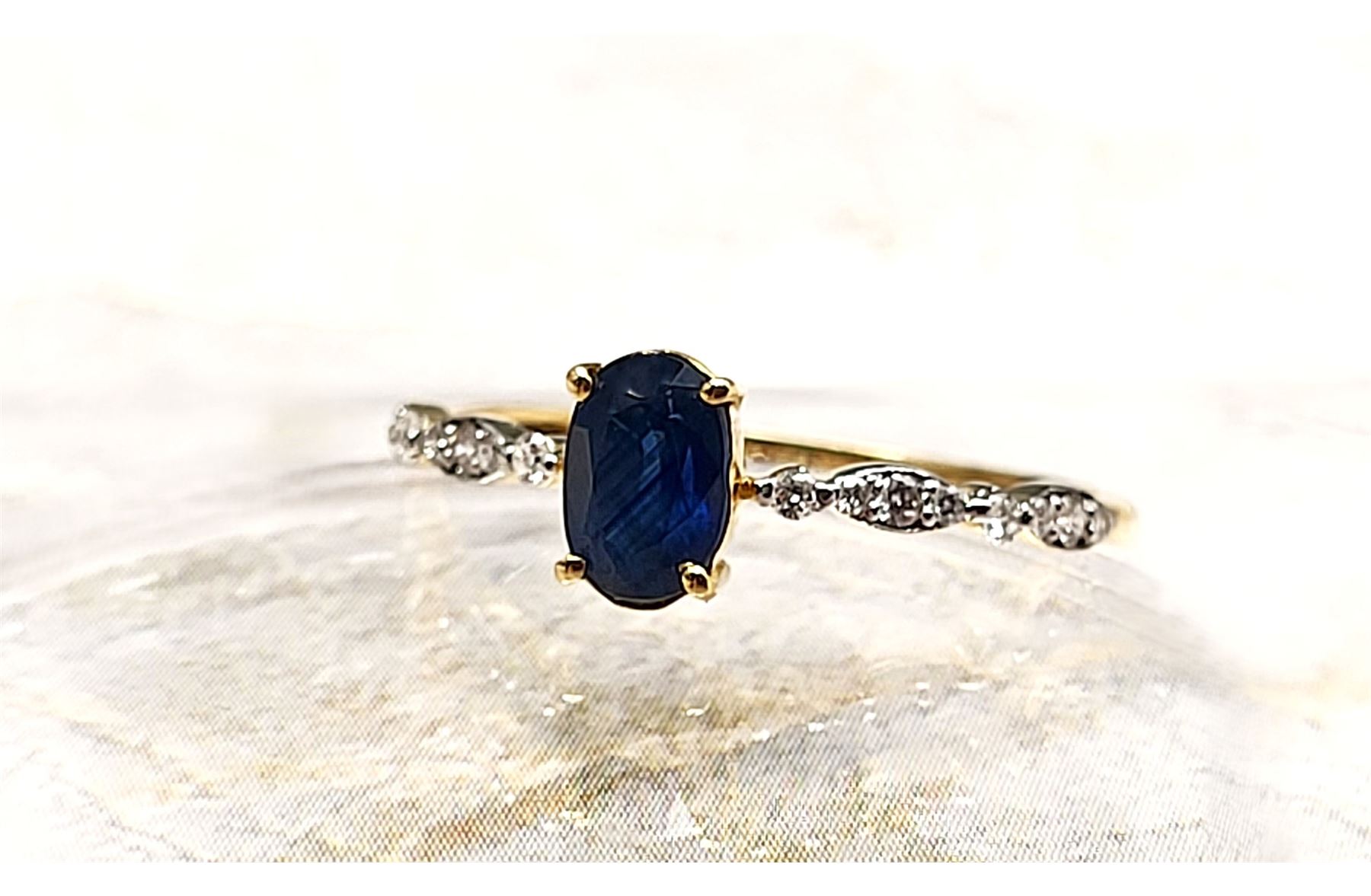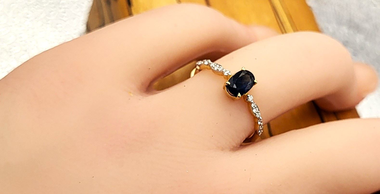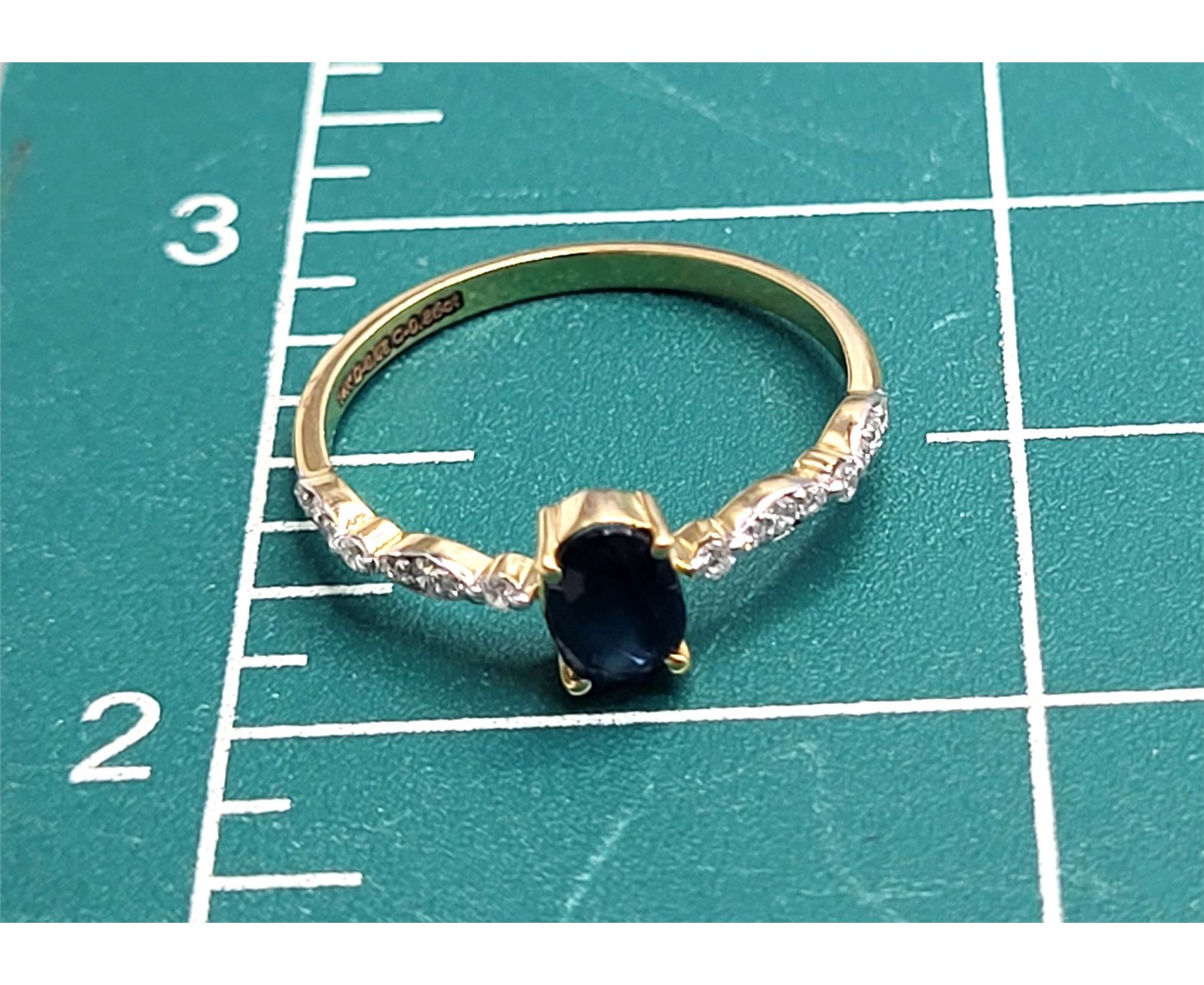 This 14 karat yellow gold ring features a .85 carat, oval-cut, genuine blue sapphire that is prong-set between .08 round, brilliant-cut, I color, SI2 clarity diamonds that are asymmetrical in size and in a wavy design on the shoulders. The ring is US size 7 with an approximate 1.7mm shank. See sizing options and other information below. 1.37g Admin: NAP994/3.85-nln