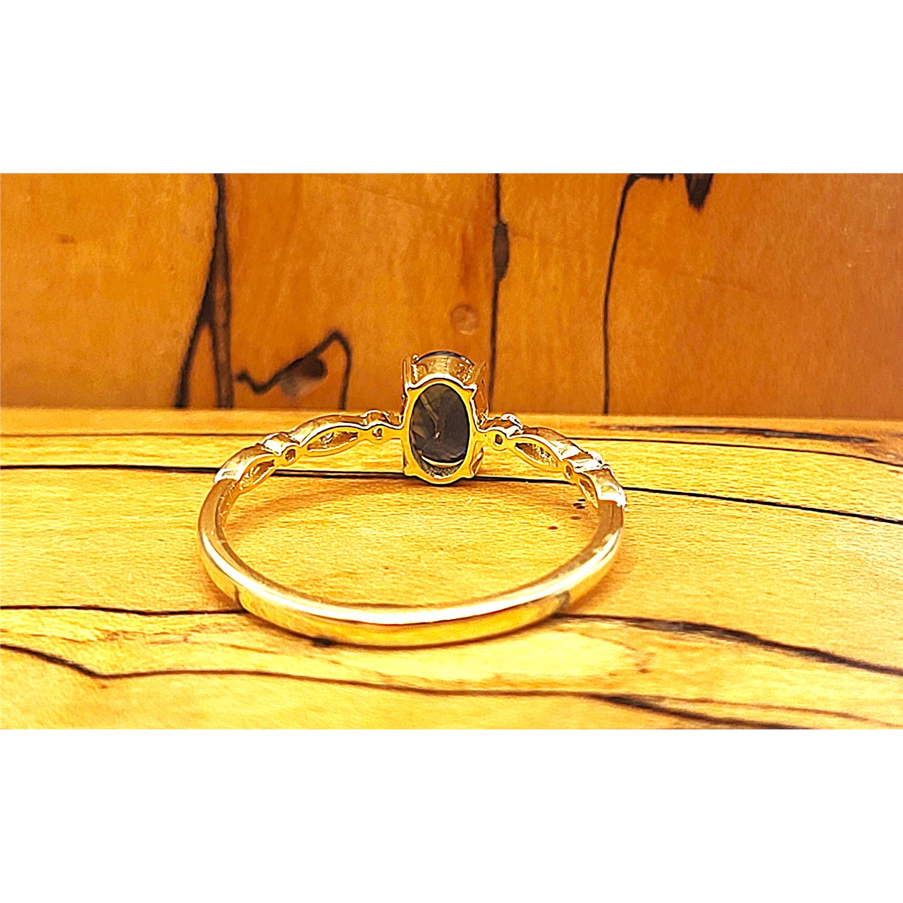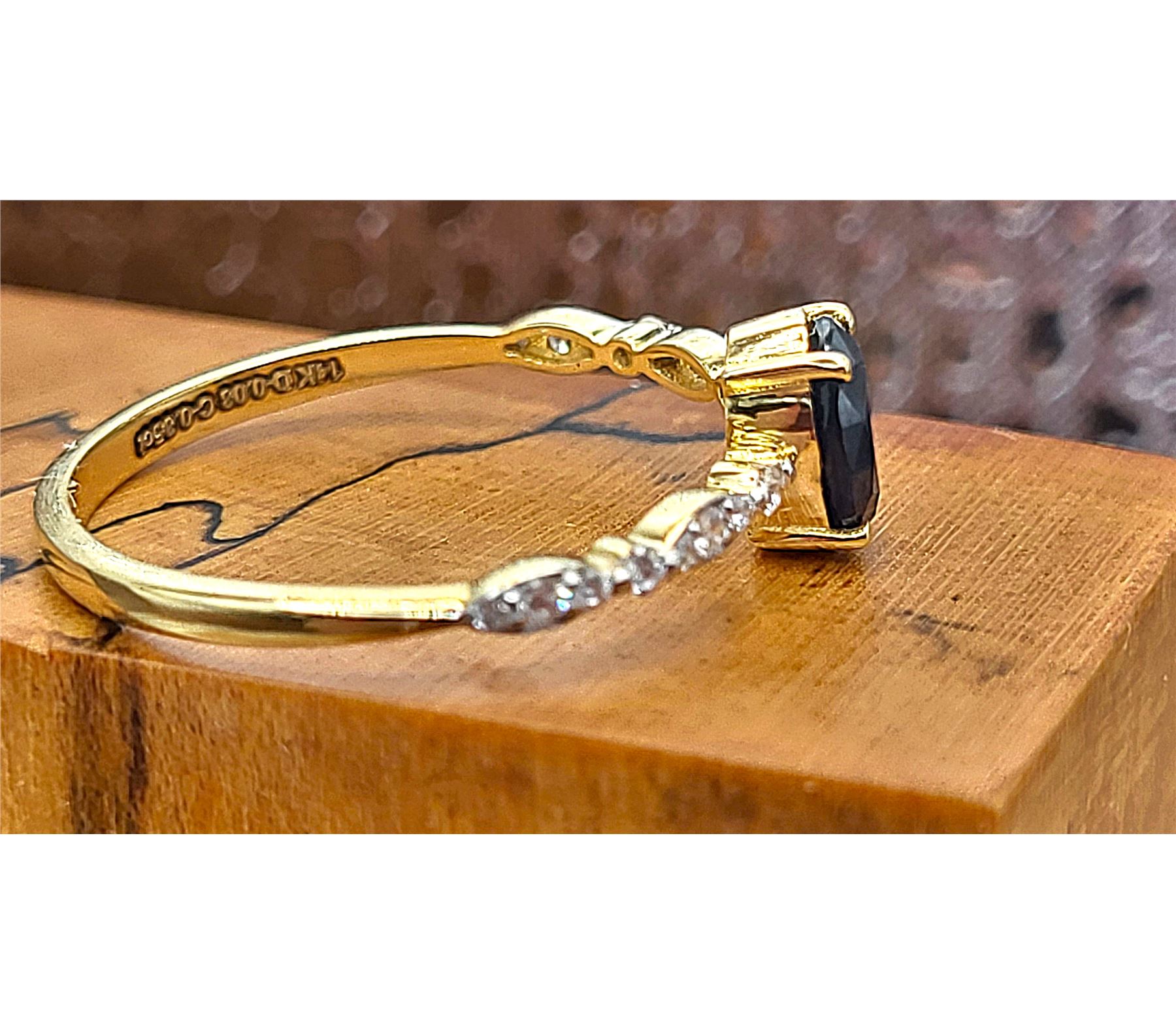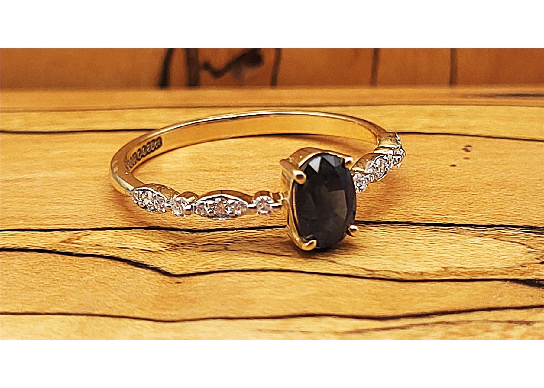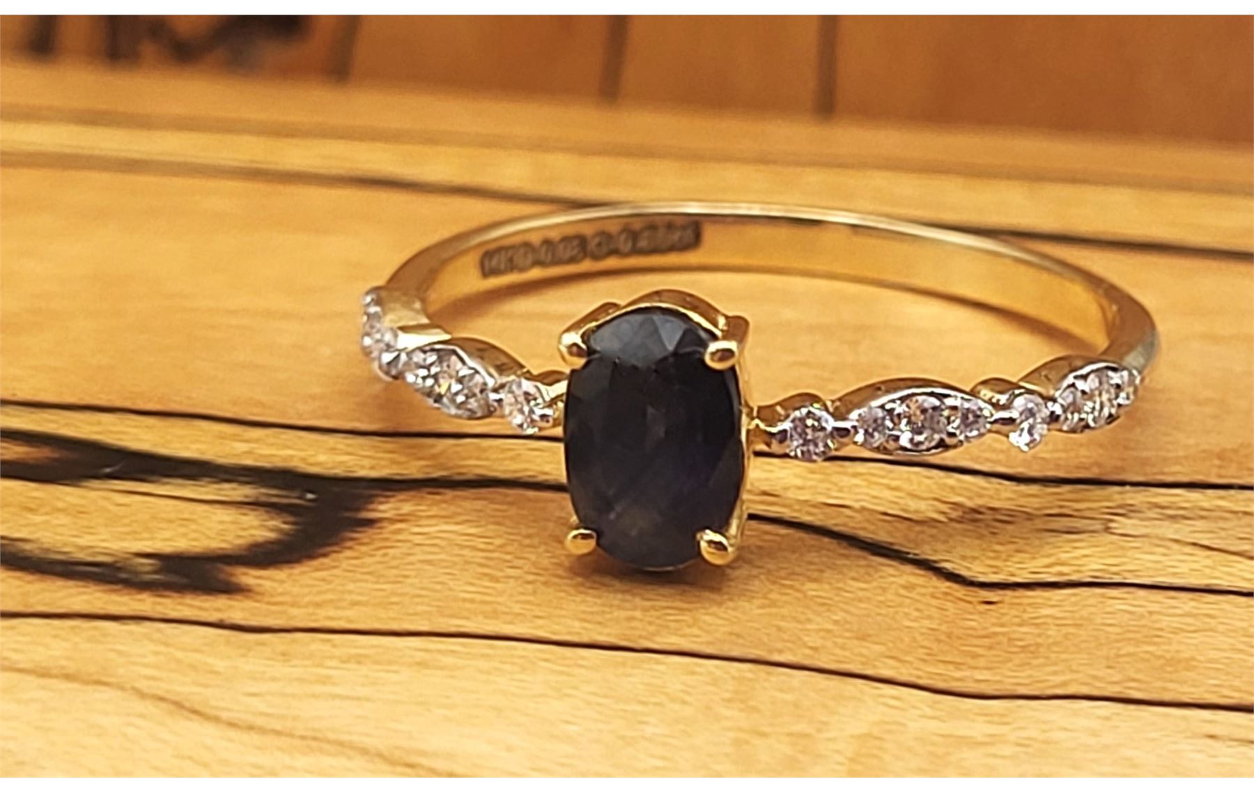 This 14 karat yellow gold ring features a .85 carat, oval-cut, genuine blue sapphire that is prong-set between .08 round, brilliant-cut, I color, SI2 clarity diamonds that are asymmetrical in size and in a wavy design on the shoulders. The ring is US size 7 with an approximate 1.7mm shank. See sizing options and other information below. 1.37g Admin: NAP994/3.85-nln