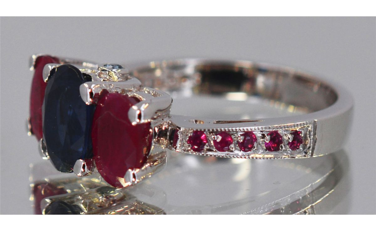 14kt White Gold 5.00 Approx grams including, 2.00ct Ruby (no lead), 1.50ct Blue Sapphire, .03cttw Blue Diamond, .10cttw Pink Diamond