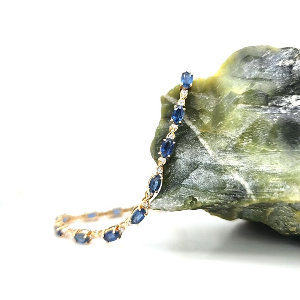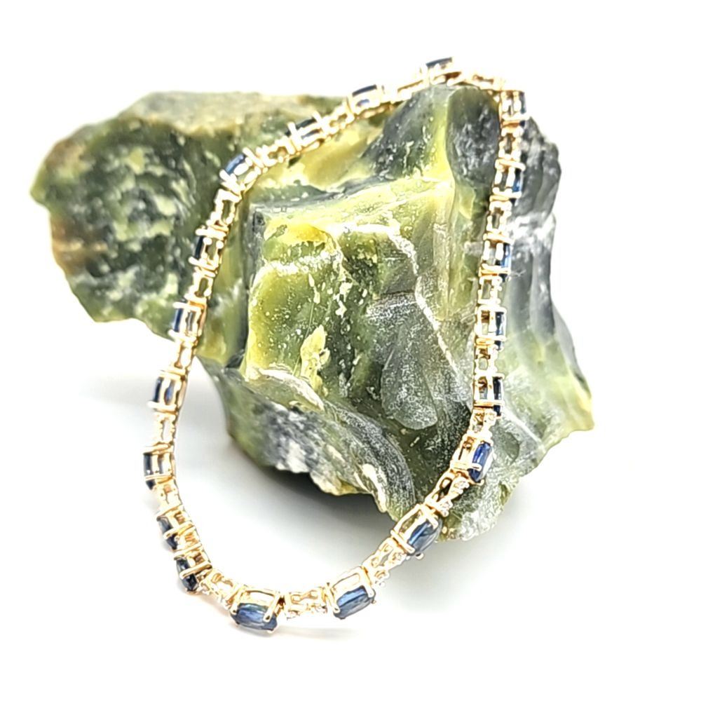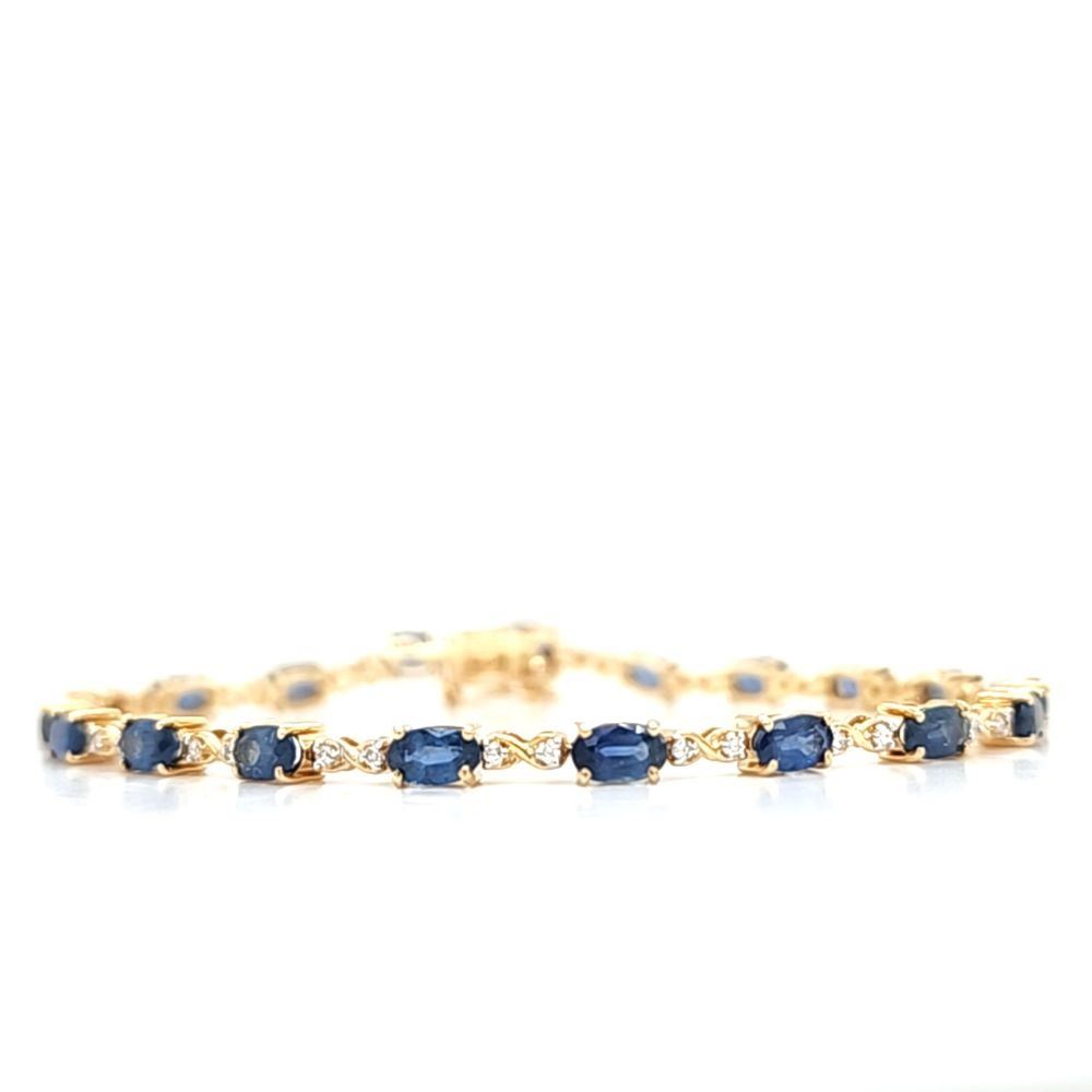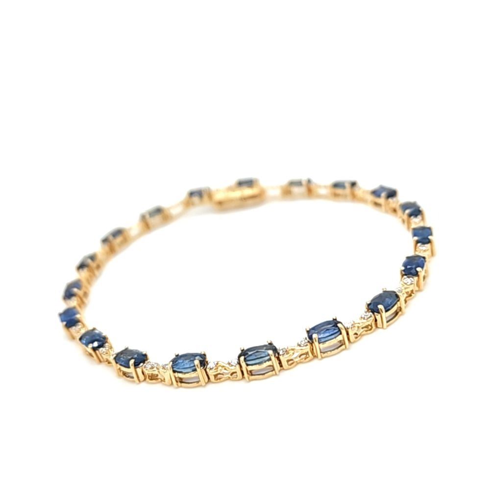 Genuine Sapphire and Earth-Mined Diamond Bracelet. This is a 14 karat yellow gold bracelet that features 4.18 carats of oval-cut, prong-set blue sapphires on hinged links with .25 carats of round, brilliant-cut, H-I color, I1 clarity diamonds used to divide the colored gemstones.& nbsp; The bracelet is 7& quot; long and has a hidden box clasp with a safety clip.& nbsp; This bracelet is certified and appraised for $10,068.00 estimated retail replacement value.& nbsp; THIS BRACELET WILL MAKE A GREAT MATCH WITH THE RING IN LOT 155!!!