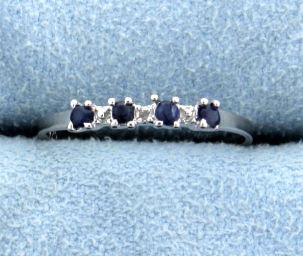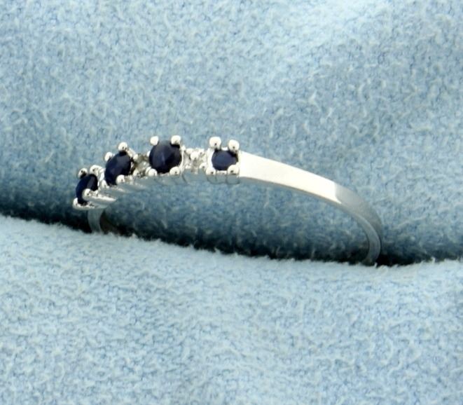 Contains .25 carats of Genuine Blue Sapphire gemstones and one 1 pt diamond. Band is platinum over sterling silver. Size 7.5. 0.8g.