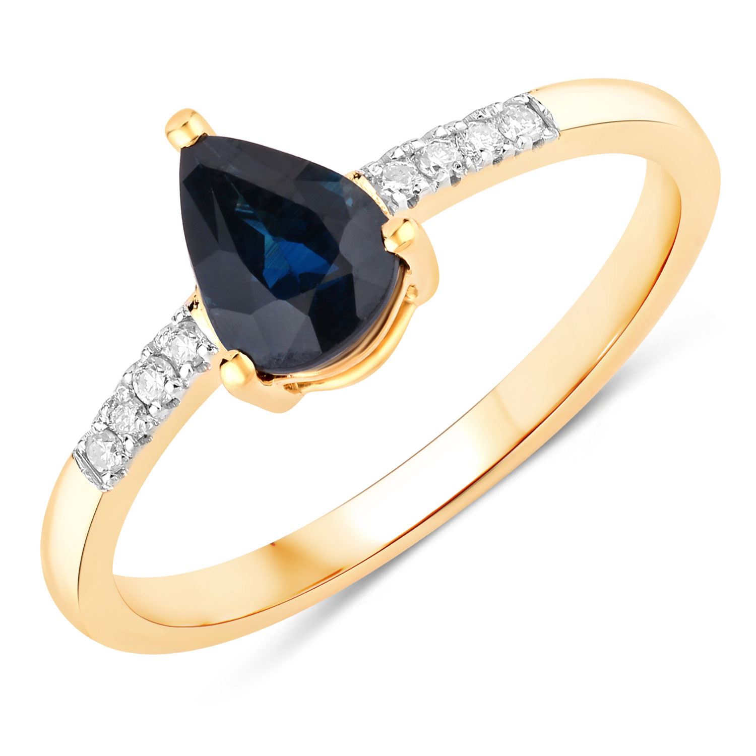 This 14 karat yellow gold ring is excellent for stacking with other rings, or to be worn alone in the minimalist style.& nbsp; Featured is a .80 carat, pear-cut, genuine blue sapphire that is prong-set on a bridge ring with .06 carats total weight of round, brilliant-cut, H-I color, I1 clarity diamonds on the classy, slender shoulders.& nbsp; Thr ring is US size 7.& nbsp; See sizing details and other information below.