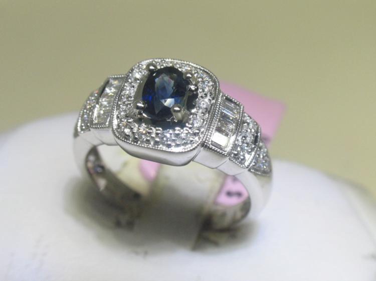 Total Weight of Baguette and Round Diamonds - 0.40 CT * 1 Center Oval cut Blue Sapphire - 0.74 CT * 14K White Gold - 4.60 grams * Ring Size: 7 * Appraised Value: $ 4,440.00 *